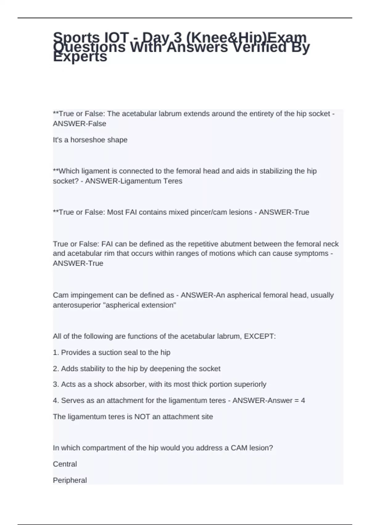 **True or False: The acetabular labrum extends around the entirety of the hip socket - ANSWER-False It's a horseshoe shape **Which ligament is connected to the femoral head and aids in stabilizing the hip socket? - ANSWER-Ligamentum Teres **True or False: Most FAI contains mixed pincer/cam lesions - ANSWER-True True or False: FAI can be defined as the repetitive abutment between the femoral neck and acetabular rim that occurs within ranges of motions which can cause symptoms - ANSWER-True Cam impingement can be defined as - ANSWER-An aspherical femoral head, usually anterosuperior "aspherical extension" All of the following are functions of the acetabular labrum, EXCEPT: 1. Provides a suction seal to the hip 2. Adds stability to the hip by deepening the socket 3. Acts as a shock absorber, with its most thick portion superiorly 4. Serves as an attachment for the ligamentum teres - ANSWER-Answer = 4 The ligamentum teres is NOT an attachment site In which compartment of the hip would you address a CAM lesion? Central Peripheral Peri trochanteric - ANSWER-Peripheral True or False: The articular cartilage of the acetabulum has a horseshoe shape - ANSWER-True True or False: A CAM deformity is a bony overgrowth of the femoral neck and is associated with chondral defects o n the acetabular transitional zone cartilage, while a pincer deformity is an overgrowth of the acetabulum and is associated with 'pinching' of the labrum and labral tears - ANSWER-True