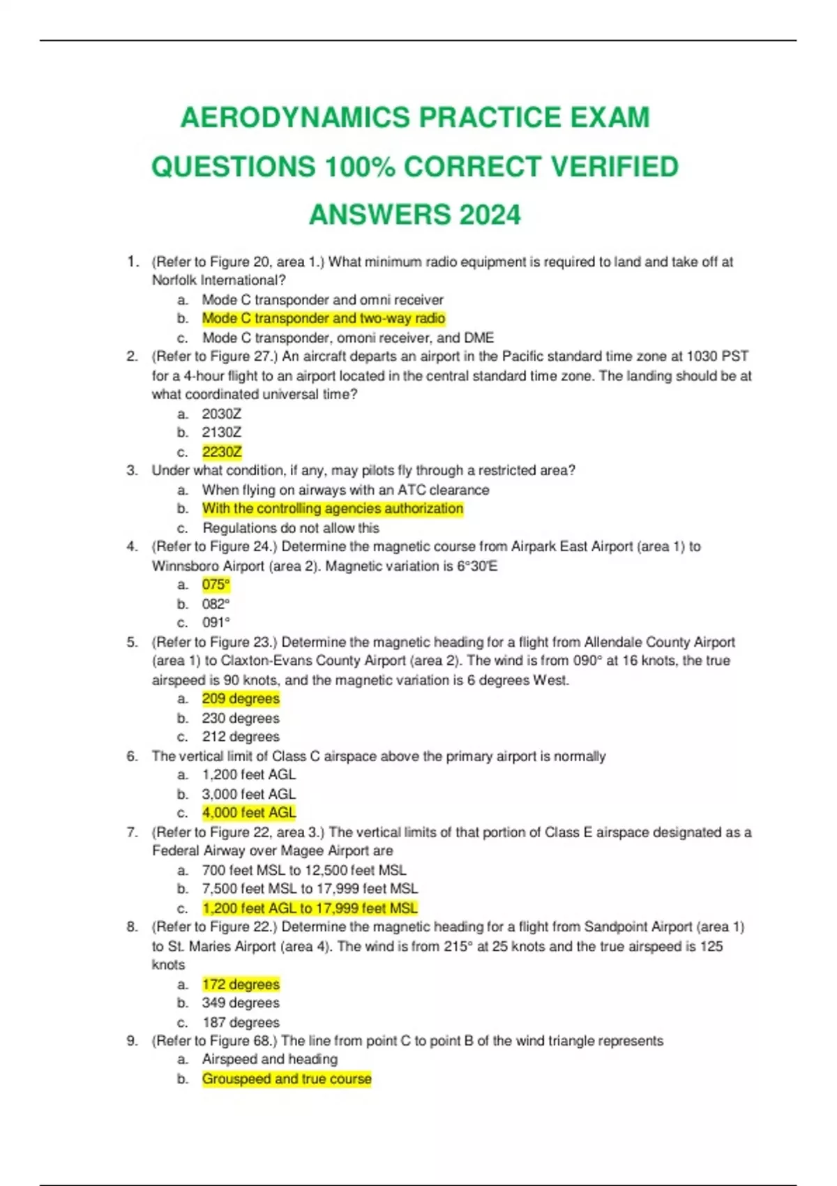 AERODYNAMICS PRACTICE EXAM QUESTIONS 100% CORRECT VERIFIED ANSWERS 2024 1. (Refer to Figure 20, area 1.) What minimum radio equipment is required to land and take off at Norfolk International? a. Mode C transponder and omni receiver b. Mode C transponder and two-way radio c. Mode C transponder, omoni receiver, and DME 2. (Refer to Figure 27.) An aircraft departs an airport in the Pacific standard time zone at 1030 PST for a 4-hour flight to an airport located in the central standard time zone. The landing should be at what coordinated universal time? a. 2030Z b. 2130Z c. 2230Z