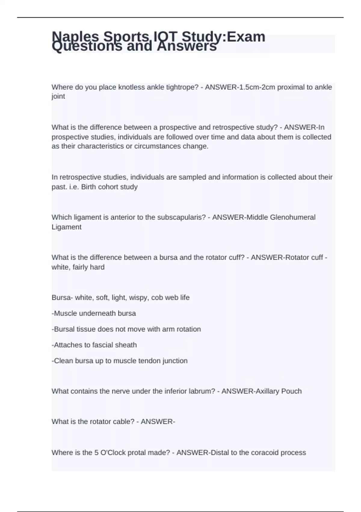 Where do you place knotless ankle tightrope? - ANSWER-1.5cm-2cm proximal to ankle joint What is the difference between a prospective and retrospective study? - ANSWER-In prospective studies, individuals are followed over time and data about them is collected as their characteristics or circumstances change. In retrospective studies, individuals are sampled and information is collected about their past. i.e. Birth cohort study Which ligament is anterior to the subscapularis? - ANSWER-Middle Glenohumeral Ligament What is the difference between a bursa and the rotator cuff? - ANSWER-Rotator cuff - white, fairly hard Bursa- white, soft, light, wispy, cob web life -Muscle underneath bursa -Bursal tissue does not move with arm rotation -Attaches to fascial sheath -Clean bursa up to muscle tendon junction What contains the nerve under the inferior labrum? - ANSWER-Axillary Pouch What is the rotator cable? - ANSWER- Where is the 5 O'Clock protal made? - ANSWER-Distal to the coracoid process Where is the Neviaser portal? - ANSWER-Soft spot on the superior aspect of the shoulder What separates the supraspinatus and infraspinatus? - ANSWER-Fat strip - underneath fat pad is a nerve What is used to fill in the bare air of the humerus? - ANSWER-Remplissage procedure What is a remplissage procedure? - ANSWER-Remplissage is an arthroscopic procedure that insets the posterior shoulder capsule and infraspinatus tendon into the Hill-Sachs defect, converting the intra-articular location of the defect to an extra-articular one. What is a Hill-Sachs lesion? - ANSWER-A Hill-Sachs lesion is a fracture in the long bone in the upper arm (humerus) that connects to the body at the shoulder. You doctor might have discovered this condition if you've experienced a dislocated shoulder. In this case, the arm bone slips out of the socket and is compressed against the socket's rim. What share does Arthrex have in the shoulder market? - ANSWER-59% Who invented the swivel lock? - ANSWER-Neil Ellistrosh Disruptive innovation = - ANSWER-Changing the game What is the historic path for Arthrex Rotator Cuff Repair? - ANSWER-Path for RCR: -Expanding suture plug -Metal corkscrew -Fiberwire