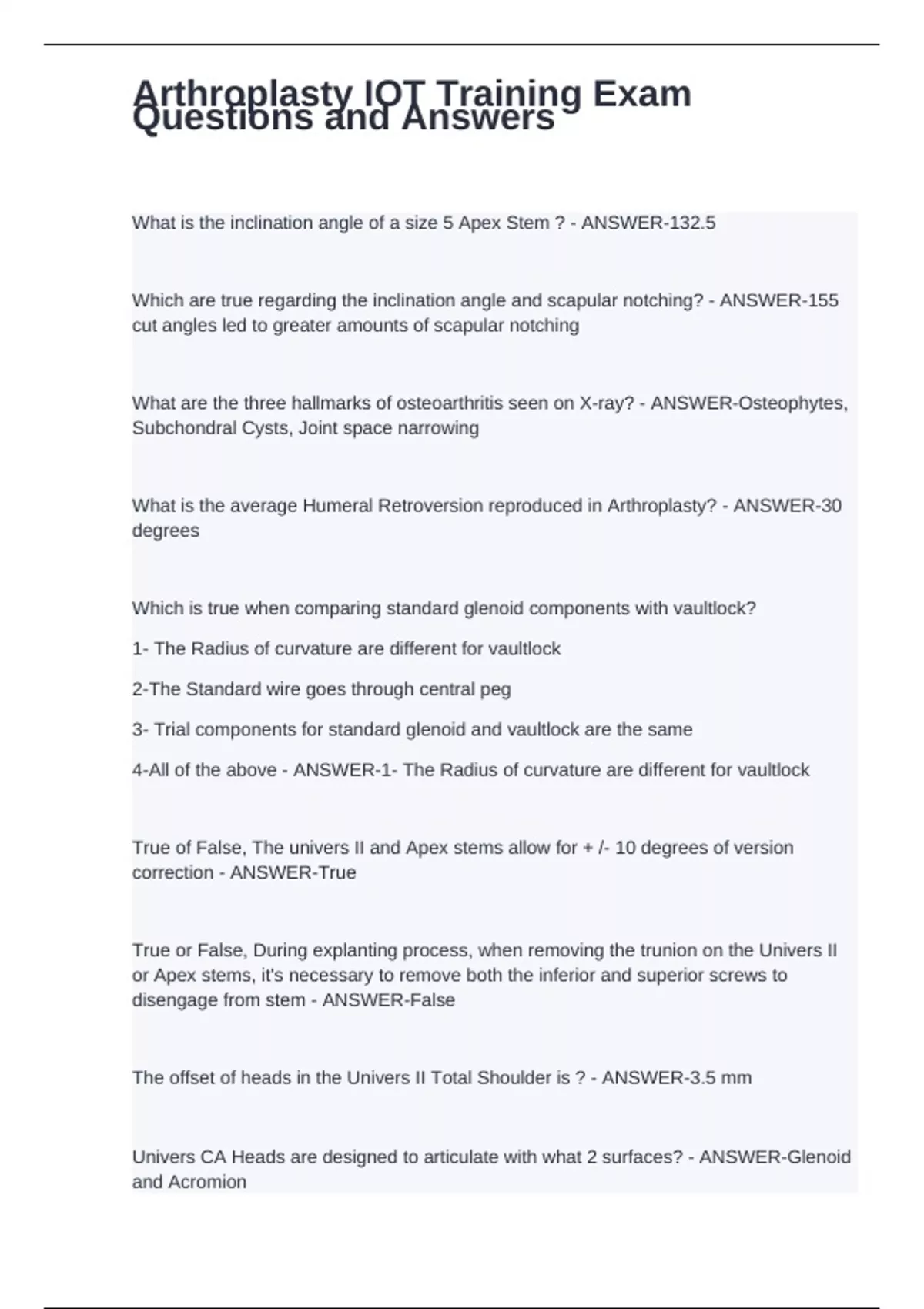 What is the inclination angle of a size 5 Apex Stem ? - ANSWER-132.5 Which are true regarding the inclination angle and scapular notching? - ANSWER-155 cut angles led to greater amounts of scapular notching What are the three hallmarks of osteoarthritis seen on X-ray? - ANSWER-Osteophytes, Subchondral Cysts, Joint space narrowing What is the average Humeral Retroversion reproduced in Arthroplasty? - ANSWER-30 degrees Which is true when comparing standard glenoid components with vaultlock? 1- The Radius of curvature are different for vaultlock 2-The Standard wire goes through central peg 3- Trial components for standard glenoid and vaultlock are the same 4-All of the above - ANSWER-1- The Radius of curvature are different for vaultlock True of False, The univers II and Apex stems allow for + /- 10 degrees of version correction - ANSWER-True True or False, During explanting process, when removing the trunion on the Univers II or Apex stems, it's necessary to remove both the inferior and superior screws to disengage from stem - ANSWER-False The offset of heads in the Univers II Total Shoulder is ? - ANSWER-3.5 mm Univers CA Heads are de