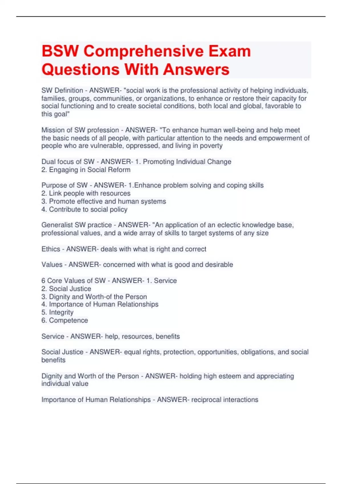 BSW Comprehensive Exam Questions With Answers SW Definition - ANSWER- "social work is the professional activity of helping individuals, families, groups, communities, or organizations, to enhance or restore their capacity for social functioning and to create societal conditions, both local and global, favorable to this goal" Mission of SW profession - ANSWER- "To enhance human well-being and help meet the basic needs of all people, with particular attention to the needs and empowerment of people who are vulnerable, oppressed, and living in poverty Dual focus of SW - ANSWER- 1. Promoting Individual Change 2. Engaging in Social Reform Purpose of SW - ANSWER- 1.Enhance problem solving and coping skills 2. Link people with resources 3. Promote effective and human systems 4. Contribute to social policy Generalist SW practice - ANSWER- "An application of an eclectic knowledge base, professional values, and a wide array of skills to target systems of any size Ethics - ANSWER- deals with what is right and correct Values - ANSWER- concerned with what is good and desirable 6 Core Values of SW - ANSWER- 1. Service 2. Social Justice 3. Dignity and Worth-of the Person 4. Importance of Human Relationships 5. Integrity 6. Competence Service - ANSWER- help, resources, benefits Social Justice - ANSWER- equal rights, protection, opportunities, obligations, and social benefits Dignity and Worth of the Person - ANSWER- holding high esteem and appreciating individual value Importance of Human Relationships - ANSWER- reciprocal interactions Integrity - ANSWER- trustworthiness and adherence to moral ideals Competence - ANSWER- having necessary skill and abilities to work effectively with client Ethical Standards and Professional Responsibilities - ANSWER- To Clients To Colleagues In Practice Settings As Professionals To the Social Work Profession To the Broader Society