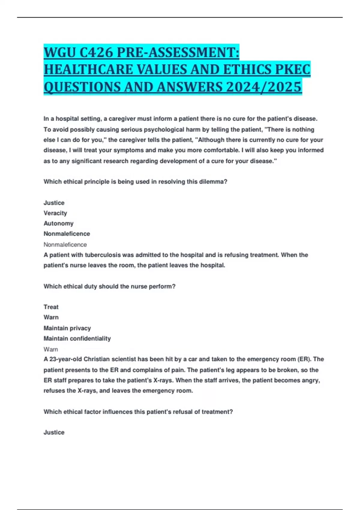 WGU C426 PRE-ASSESSMENT: HEALTHCARE VALUES AND ETHICS PKEC QUESTIONS AND ANSWERS 2024/2025