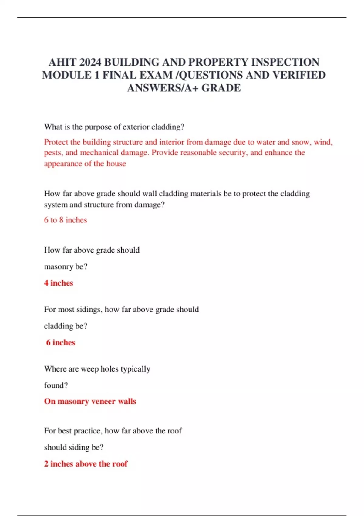 AHIT 2024 BUILDING AND PROPERTY INSPECTION MODULE 1 FINAL EXAM /QUESTIONS AND VERIFIED ANSWERS/A+ GRADE