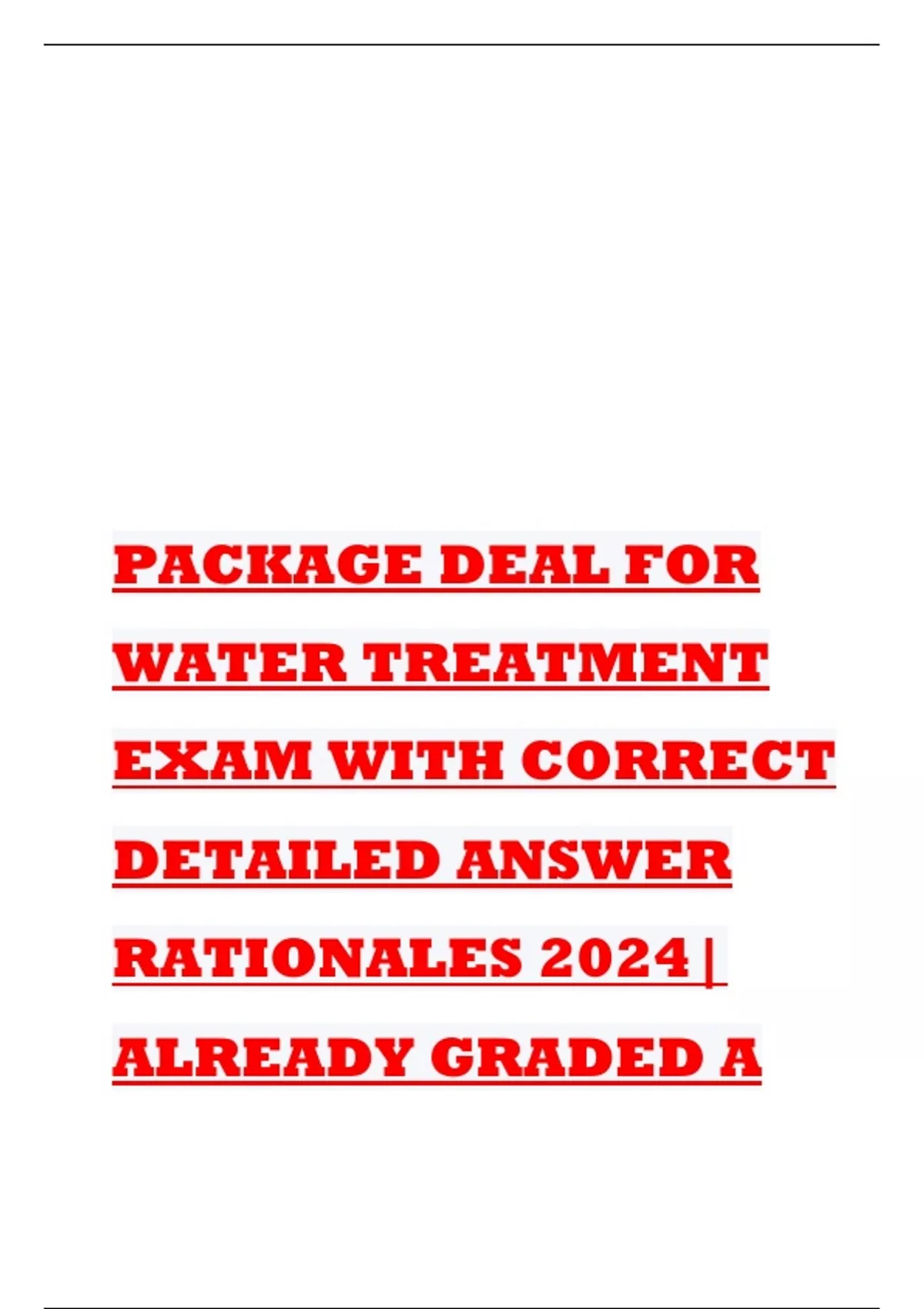 PACKAGE DEAL FOR WATER TREATMENT EXAM WITH CORRECT DETAILED ANSWER RATIONALES 2024| ALREADY GRADED A What are two types of water resources? -ANSWER- Ground water and Surface water