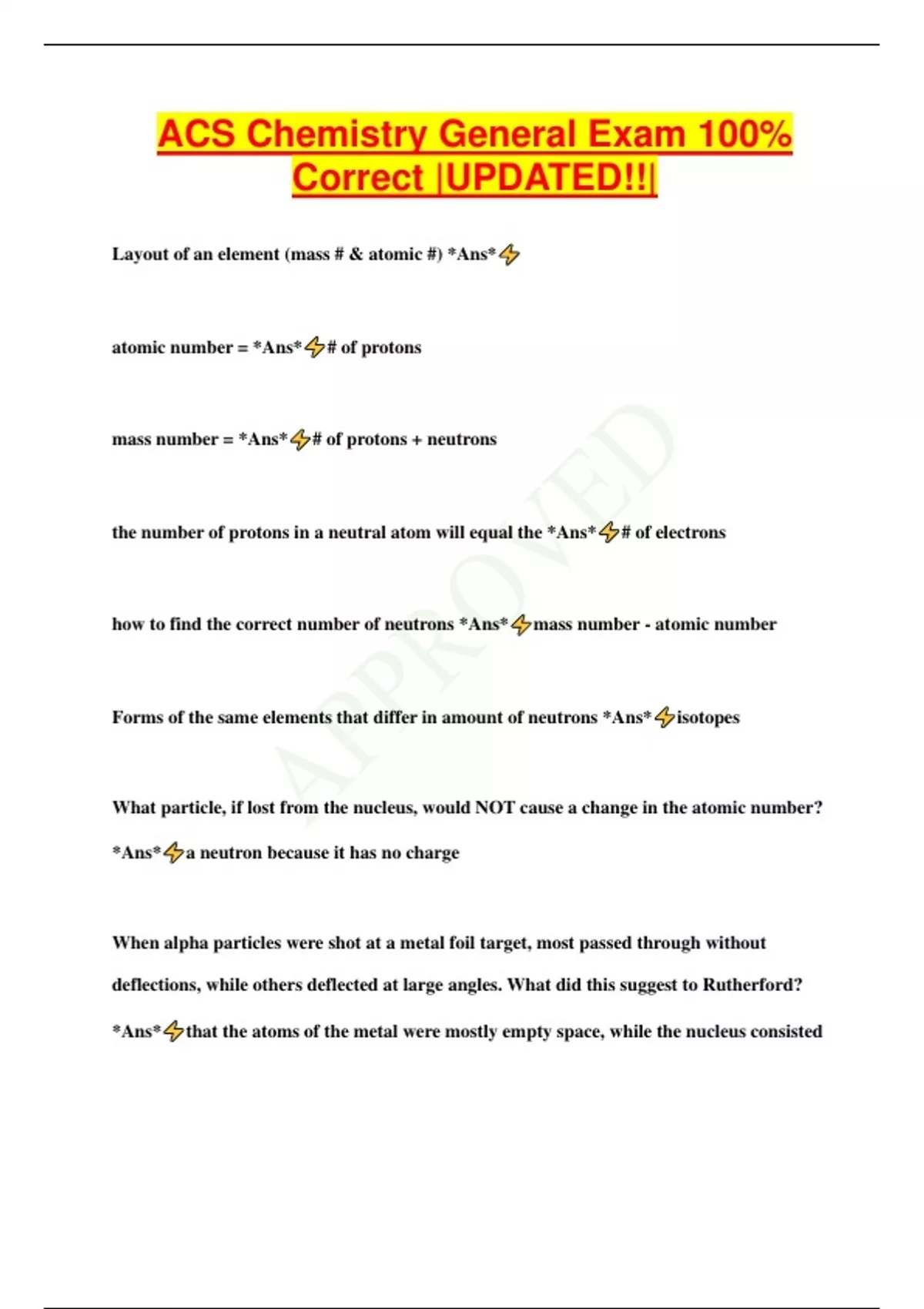 ACS Chemistry General Exam 100% Correct |UPDATED!!| Layout of an element (mass # & atomic #) *Ans* atomic number = *Ans* # of protons mass number = *Ans* # of protons + neutrons the number of protons in a neutral atom will equal the *Ans* # of electrons how to find the correct number of neutrons *Ans* mass number - atomic number Forms of the same elements that differ in amount of neutrons *Ans* isotopes What particle, if lost from the nucleus, would NOT cause a change in the atomic number? *Ans* a neutron because it has no charge When alpha particles were shot at a metal foil target, most passed through without deflections, while others deflected at large angles. What did this suggest to Rutherford? *Ans* that the atoms of the metal were mostly empty space, while the nucleus consisted of most of the mass which included highly condensed positive particles (which caused the deflection). An atom has a valence shell configuration of 1s1. To which group of elements on the periodic table does it belong? *Ans* IA alkali metals electromagnetic spectrum *Ans* The greater the wavelength of a photon..? *Ans* the lower its frequency The greater the frequency of a photon...? *Ans* the shorter its wavelength Light energy formula *Ans* What does C in the light energy formula represent? *Ans* Give the ground-state electron configuration of an atom in the second period *Ans* 1s2 2s1 Electrons configuration rule that states electrons do not pair until t