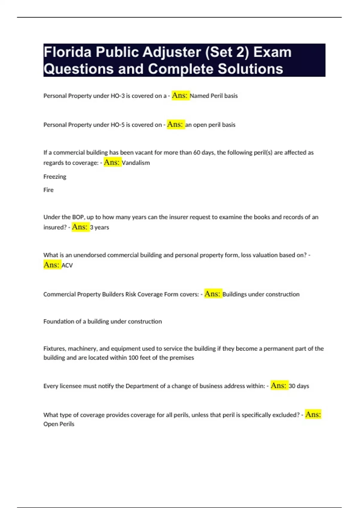 Florida Public Adjuster (Set 2) Exam Questions and Complete Solutions