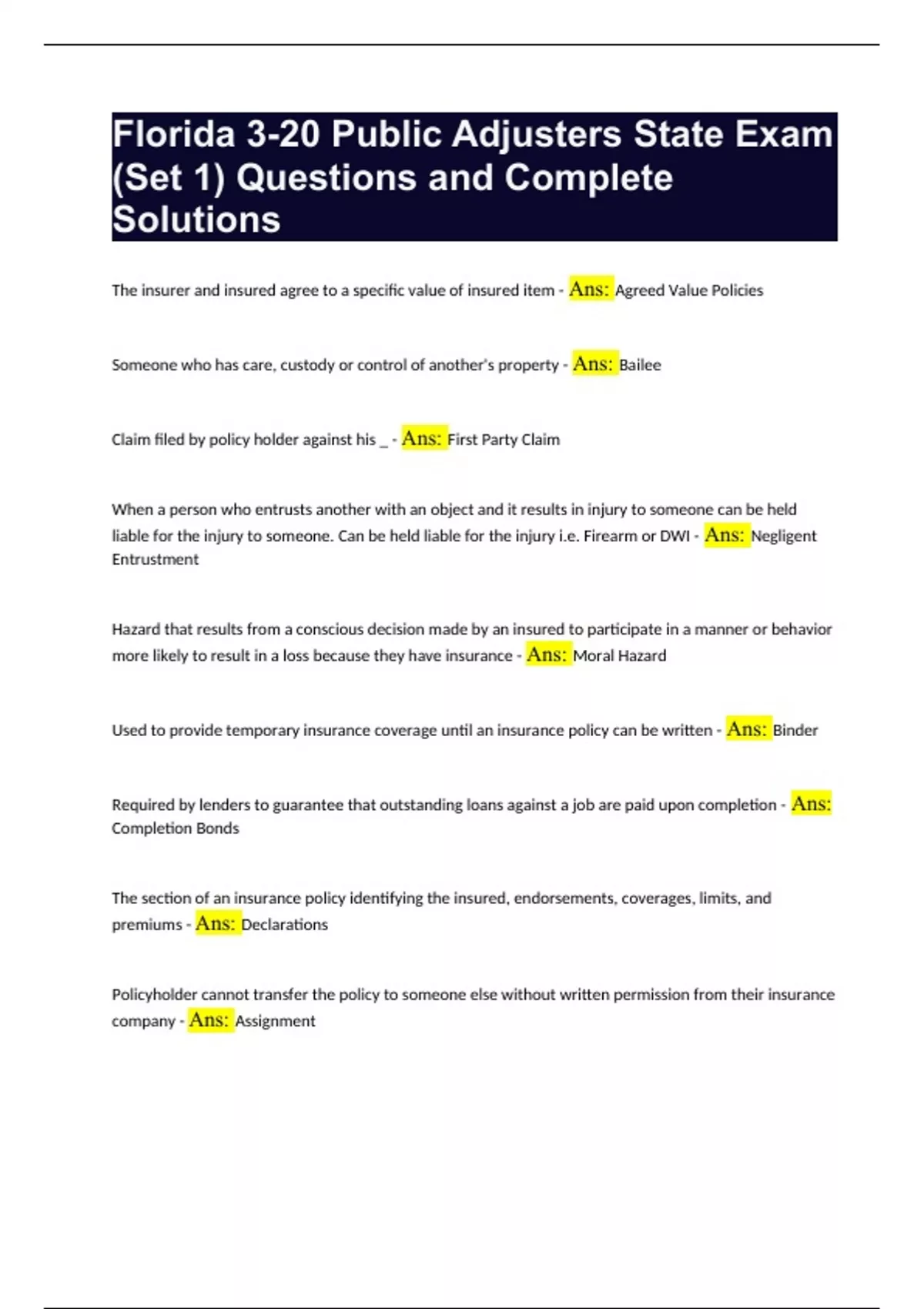 Florida 3-20 Public Adjusters State Exam (Set 1) Questions and Complete Solutions