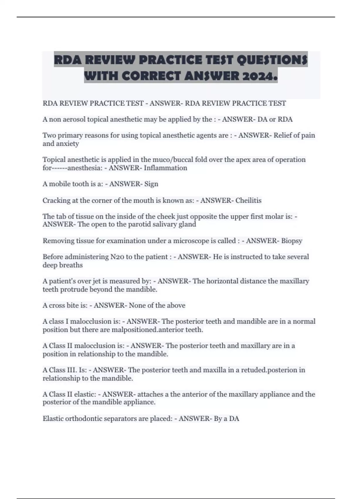 RDA REVIEW PRACTICE TEST QUESTIONS WITH CORRECT ANSWER 2024.