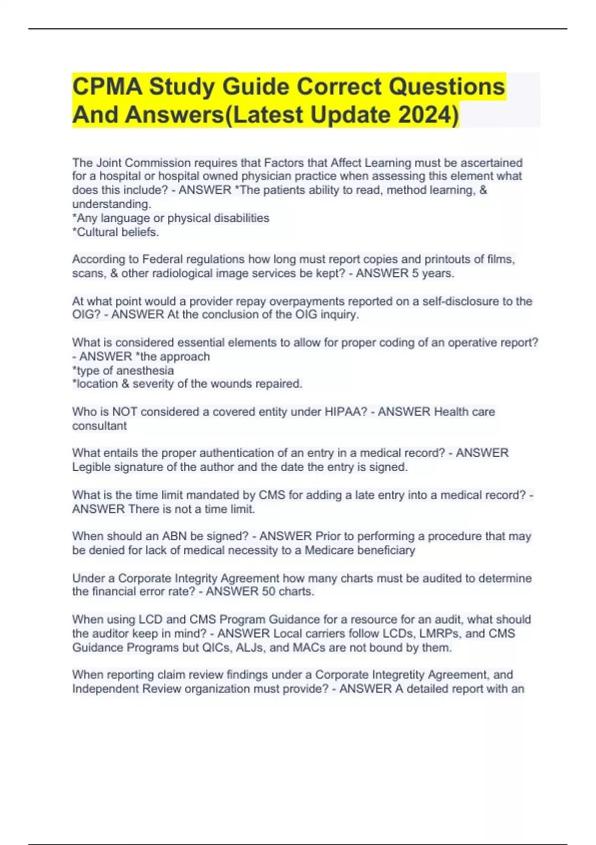 The Joint Commission requires that Factors that Affect Learning must be ascertained for a hospital or hospital owned physician practice when assessing this element what does this include? - ANSWER *The patients ability to read, method learning, & understanding. *Any language or physical disabilities *Cultural beliefs. According to Federal regulations how long must report copies and printouts of films, scans, & other radiological image services be kept? - ANSWER 5 years. At what point would a provider repay overpayments reported on a self-disclosure to the OIG? - ANSWER At the conclusion of the OIG inquiry. What is considered essential elements to allow for proper coding of an operative report? - ANSWER *the approach *type of anesthesia *location & severity of the wounds repaired. Who is NOT considered a covered entity under HIPAA? - ANSWER Health care consultant What entails the proper authentication of an entry in a medical record? - ANSWER Legible signature of the author and the date the entry is signed. What is the time limit mandated by CMS for adding a late entry into a medical record? - ANSWER There is not a time limit. When should an ABN be signed? - ANSWER Prior to performing a procedure that may be denied for lack of medical necessity to a Medicare beneficiary Under a Corporate Integrity Agreement how many charts must be audited to determine the financial error rate? - ANSWER 50 charts. When using LCD and CMS Program Guidance for a resource for an audit, what should the auditor keep in mind? - ANSWER Local carriers follow LCDs, LMRPs, and CMS Guidance Programs but QICs, ALJs, and MACs are not bound by them.