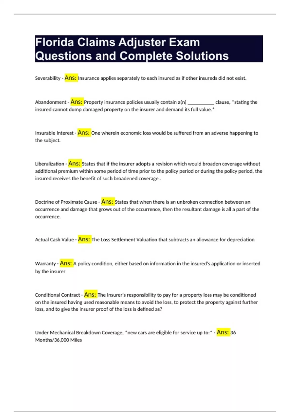 Florida Claims Adjuster Exam Questions and Complete Solutions