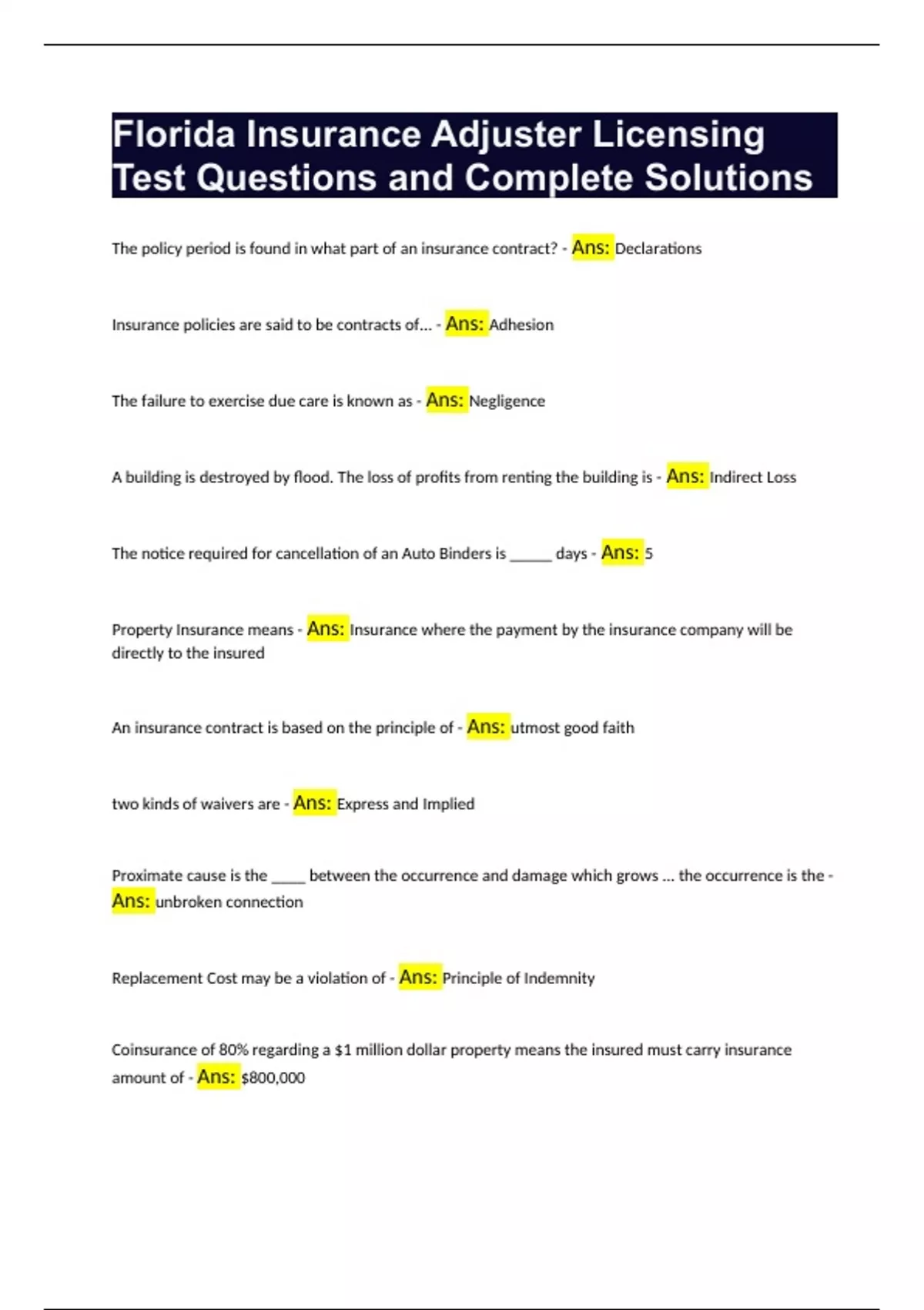 Florida Insurance Adjuster Licensing Test Questions and Complete Solutions
