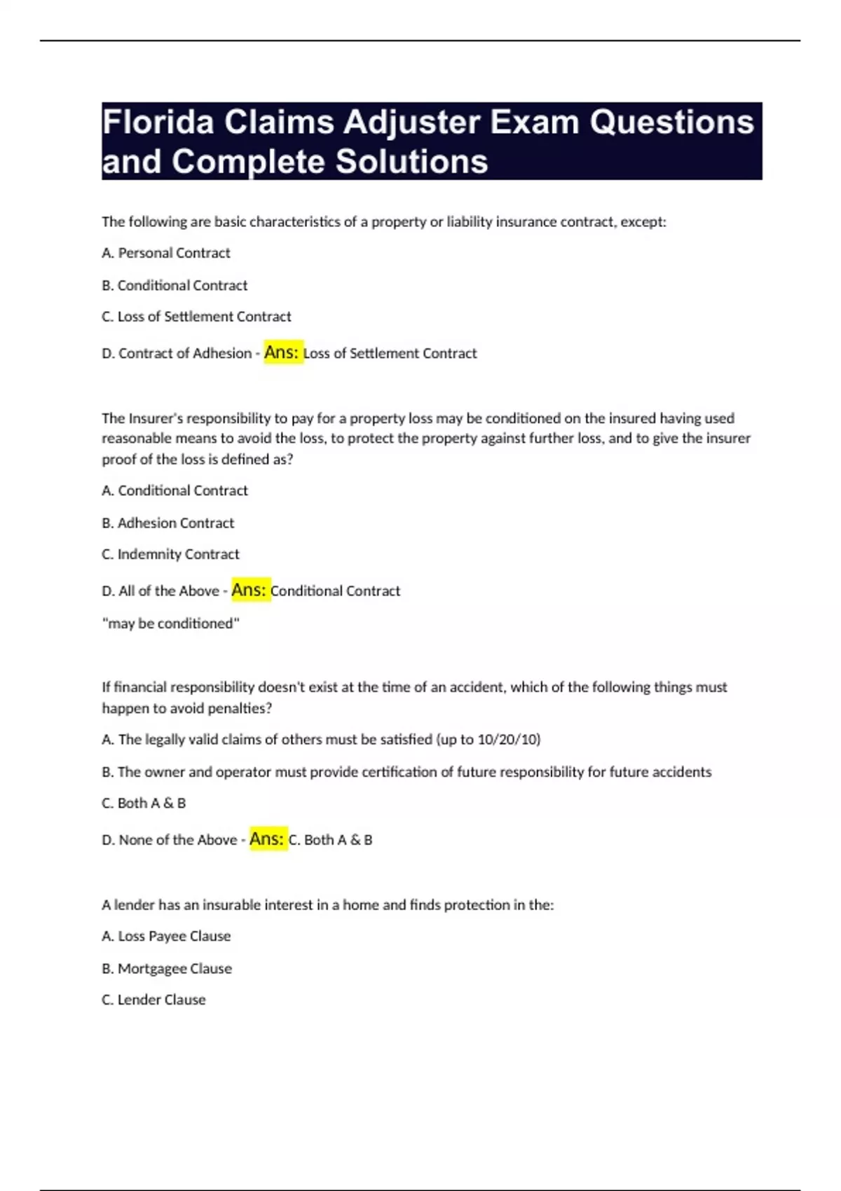 Florida Claims Adjuster Exam Questions and Complete Solutions.