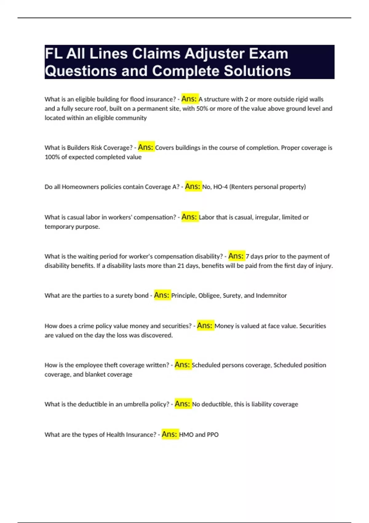 FL All Lines Claims Adjuster Exam Questions and Complete Solutions