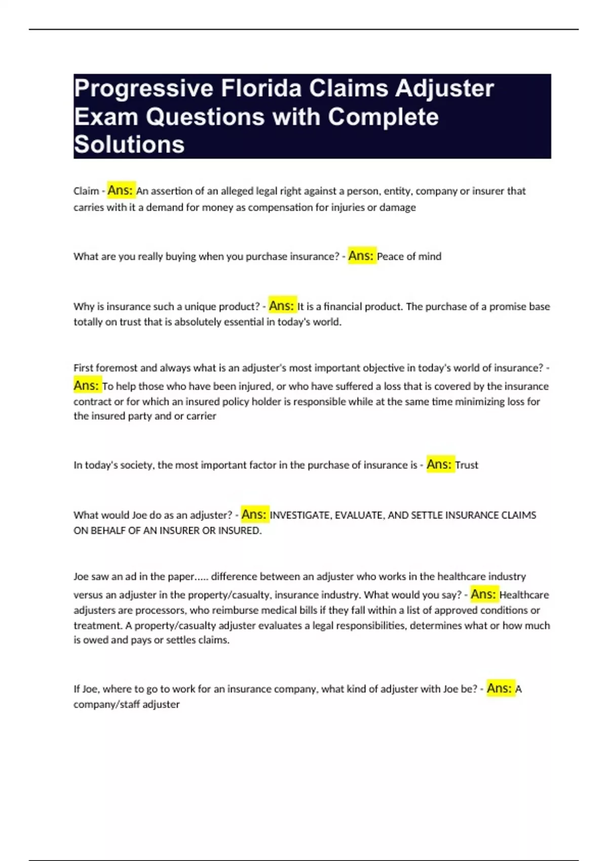 Progressive Florida Claims Adjuster Exam Questions with Complete Solutions