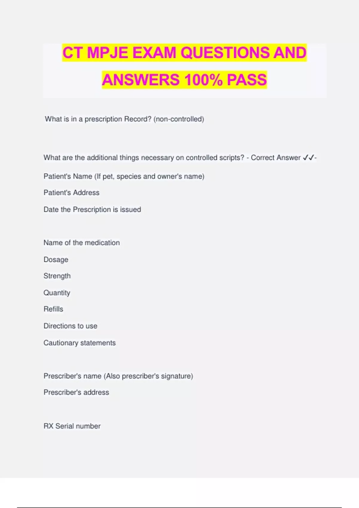CT MPJE EXAM QUESTIONS AND ANSWERS 100% PASS What is in a prescription Record? (non-controlled) What are the additional things necessary on controlled scripts? - Correct Answer ️️ - Patient's Name (If pet, species and owner's name) Patient's Address Date the Prescription is issued Name of the medication Dosage Strength Quantity Refills Directions to use Cautionary statements Prescriber's name (Also prescriber's signature) Prescriber's address RX Serial number Date Script is filled/refilled on face/back of script Retail price of generic substitute Dispensing pharmacist's initials For controlled: Need Prescriber DEA# and Age of patient (or indication of adult/child) ****Prescriber signatures are necessary if the medication is controlled or if the script is written. NDC how many digits and how are the digits split? - Correct Answer ️️ -11 digits, first 5= manufacturer, 4= Drug ID, 2= package size What are things on Prescription record (Rx itself) not needed on RX label? - Correct Answer ️️ -Prescriber address (technically its needed if its a controlled medication) Dosage form of Medication Retail price of generic substitution Dispensing pharmacist initials How long to file prescriptions? - Correct Answer ️️ -3 years **Controlled substances must be filed in separate files. How many prescriptions on schedule II pad? - Correct Answer ️️ -One only **non CII meds can be put on to one prescription. T/F- All prescription must be written in ink, indelible pencil or typewriter. No duplicate, carbon, photographic copies or rubber-stamped orders are valid prescriptions. - Correct Answer ️️ -True Prescription record requirements, non controlled drug - Correct Answer ️️ -patients name, animal name and owner, address, date Rx issued, name of med, strength of med, quantity, directions, cautionary statements, refills, prescriber and address, date rx filled, serial number, pharmacist initials, retail price of generic substitute Prescription record- controlled - Correct Answer ️️ -patients name, animal name and owner, address, date Rx issued, name of med, strength of med, quantity, directions, cautionary statements, refills, prescriber and address, date rx filled, serial number, pharmacist initials, retail price of generic substitute Specific- patient age or adult/child, DEA Prescription label- non controlled - Correct Answer ️️ -pharmacy name and address, patient name, name of medication, strength, quantity, directions, cautionary, expiration, serial number, date dispensed, prescribers name ***Pharmacist shall label the prescription container with the name of the dispensed drug product. If the dispensed drug product does not have a brand name, the prescription label shall indicate the generic name of the drug dispensed along with manufacturer or distributor. prescription label- control - Correct Answer ️️ -pharmacy name and address, patient name, name of medication, strength, quantity, directions, cautionary, expiration, serial number, date filled (and refilled for CIII and CIV), prescribers name (and prescriber address) cautionary- federal law prohibits transfer of this drug to any person other than the patient for whom it is prescribed **Controlled medications require prescriber address on the label where has non- controlled does not require prescriber address. Which schedule of medications can't be refilled? - Correct Answer ️️ -CII (all the other ones can be refilled) What statement needs to be on pharmacy bag/receipt to be given to patient? - Correct Answer ️️ -If you have a concern that an error may have occurred in the dispensing of your prescription you may contact the department of consumer protection, drug control division by calling (phone#) (T/F)Prescriber name is required on controlled medication labels but not on non- controlled medication labels - Correct Answer ️️ -False! Prescriber name is required on both but prescriber address is only required on controlled medication labels. Certain medications may also require this ________ be provided with the medication at the time of dispensing. - Correct Answer ️️ -Package Insert or Medication Guide When transferring a prescription what must the transferring pharmacist do? - Correct Answer ️️ -Cancel the Script and write void on the FACE of the RX In the books record the name, address and DEA # of the pharmacy Include the name of the receiving pharmacist's name Write the date of transfer and the name of the transferring pharmacist When transferring a prescription what must the receiving pharmacist do? - Correct Answer ️️ -Write "transfer" in pharmacy record Include the name, address and DEA # of transferring pharmacy