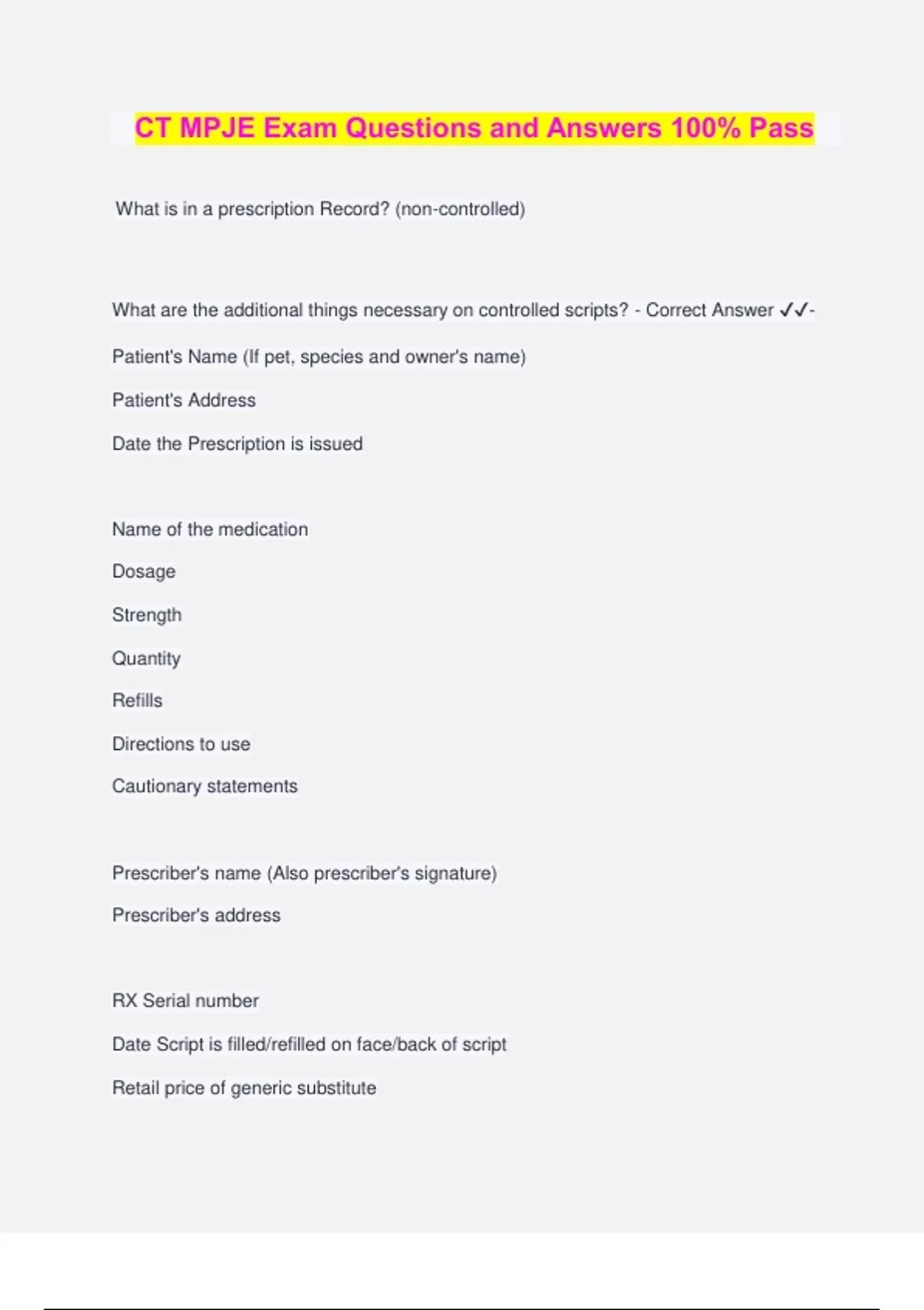 CT MPJE Exam Questions and Answers 100% Pass What is in a prescription Record? (non-controlled) What are the additional things necessary on controlled scripts? - Correct Answer ️️ - Patient's Name (If pet, species and owner's name) Patient's Address Date the Prescription is issued Name of the medication Dosage Strength Quantity Refills Directions to use Cautionary statements Prescriber's name (Also prescriber's signature) Prescriber's address RX Serial number Date Script is filled/refilled on face/back of script Retail price of generic substitute Dispensing pharmacist's initials For controlled: Need Prescriber DEA# and Age of patient (or indication of adult/child) ****Prescriber signatures are necessary if the medication is controlled or if the script is written. NDC how many digits and how are the digits split? - Correct Answer ️️ -11 digits, first 5= manufacturer, 4= Drug ID, 2= package size What are things on Prescription record (Rx itself) not needed on RX label? - Correct Answer ️️ -Prescriber address (technically its needed if its a controlled medication) Dosage form of Medication Retail price of generic substitution Dispensing pharmacist initials How long to file prescriptions? - Correct Answer ️️ -3 years **Controlled substances must be filed in separate files. How many prescriptions on schedule II pad? - Correct Answer ️️ -One only **non CII meds can be put on to one prescription. T/F- All prescription must be written in ink, indelible pencil or typewriter. No duplicate, carbon, photographic copies or rubber-stamped orders are valid prescriptions. - Correct Answer ️️ -True Prescription record requirements, non controlled drug - Correct Answer ️️ -patients name, animal name and owner, address, date Rx issued, name of med, strength of med, quantity, directions, cautionary statements, refills, prescriber and address, date rx filled, serial number, pharmacist initials, retail price of generic substitute Prescription record- controlled - Correct Answer ️️ -patients name, animal name and owner, address, date Rx issued, name of med, strength of med, quantity, directions, cautionary statements, refills, prescriber and address, date rx filled, serial number, pharmacist initials, retail price of generic substitute Specific- patient age or adult/child, DEA Prescription label- non controlled - Correct Answer ️️ -pharmacy name and address, patient name, name of medication, strength, quantity, directions, cautionary, expiration, serial number, date dispensed, prescribers name ***Pharmacist shall label the prescription container with the name of the dispensed drug product. If the dispensed drug product does not have a brand name, the prescription label shall indicate the generic name of the drug dispensed along with manufacturer or distributor. prescription label- control - Correct Answer ️️ -pharmacy name and address, patient name, name of medication, strength, quantity, directions, cautionary, expiration, serial number, date filled (and refilled for CIII and CIV), prescribers name (and prescriber address) cautionary- federal law prohibits transfer of this drug to any person other than the patient for whom it is prescribed **Controlled medications require prescriber address on the label where has non- controlled does not require prescriber address. Which schedule of medications can't be refilled? - Correct Answer ️️ -CII (all the other ones can be refilled) What statement needs to be on pharmacy bag/receipt to be given to patient? - Correct Answer ️️ -If you have a concern that an error may have occurred in the dispensing of your prescription you may contact the department of consumer protection, drug control division by calling (phone#) (T/F)Prescriber name is required on controlled medication labels but not on non- controlled medication labels - Correct Answer ️️ -False! Prescriber name is required on both but prescriber address is only required on controlled medication labels. Certain medications may also require this ________ be provided with the medication at the time of dispensing. - Correct Answer ️️ -Package Insert or Medication Gui