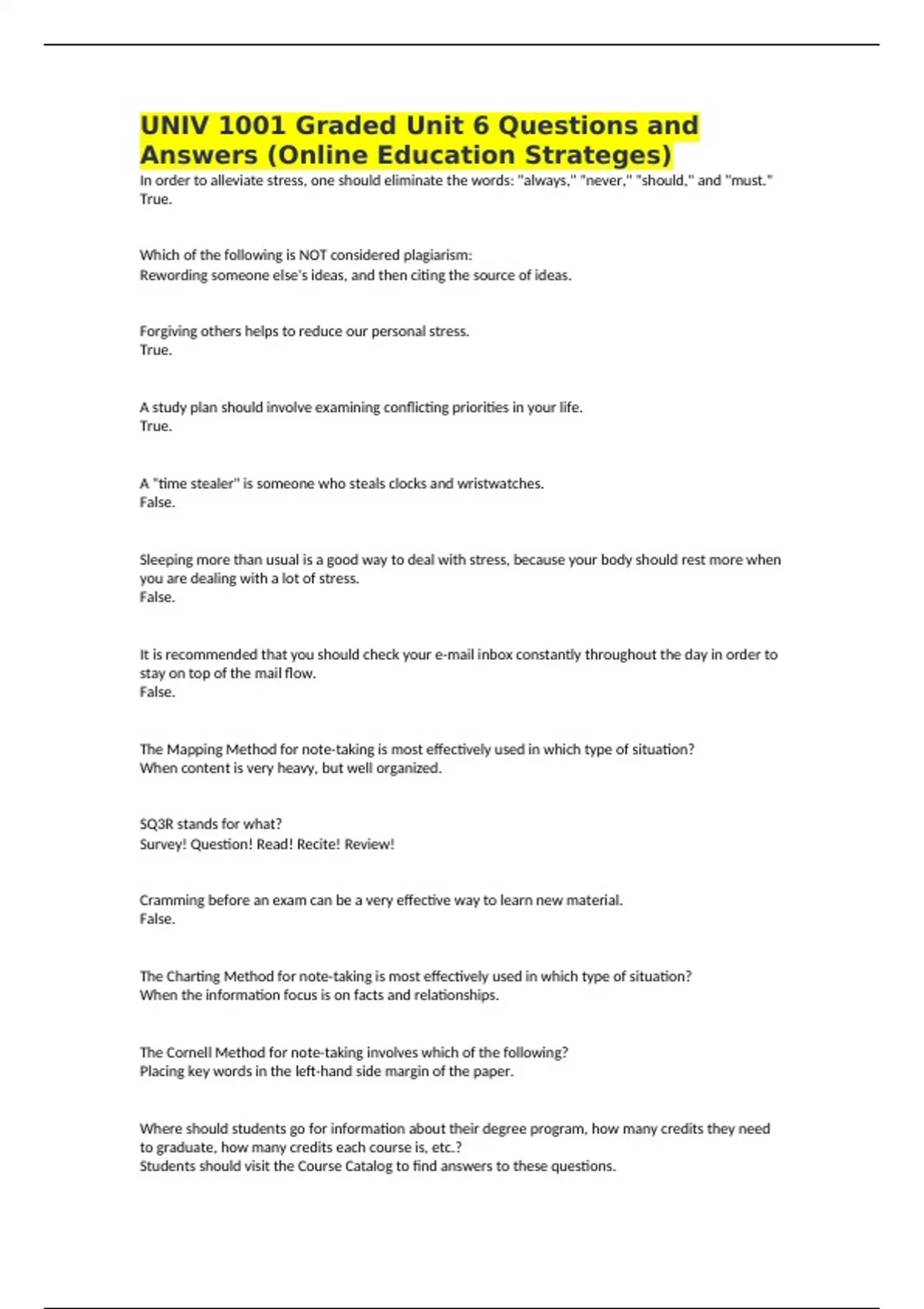 UNIV 1001 Graded Unit 6 Questions and Answers (Online Education Strateges) In order to alleviate stress, one should eliminate the words: "always," "never," "should," and "must." True. Which of the following is NOT considered plagiarism: Rewording someone else's ideas, and then citing the source of ideas. Forgiving others helps to reduce our personal stress. True. A study plan should involve examining conflicting priorities in your life. True. A "time stealer" is someone who steals clocks and wristwatches. False. Sleeping more than usual is a good way to deal with stress, because your body should rest more when you are dealing with a lot of stress. False. It is recommended that you should check your e-mail inbox constantly throughout the day in order to stay on top of the mail flow. False. The Mapping Method for note-taking is most effectively used in which type of situation? When content is very heavy, but well organized. SQ3R stands for what? Survey! Question! Read! Recite! Review! Cramming before an exam can be a very effective way to learn new material. False. The Charting Method for note-taking is most effectively used in which type of situation? When the information focus is on facts and relationships. The Cornell Method for note-taking involves which of the following? Placing key words in the left-hand side margin of the paper. Where should students go for information about their degree program, how many credits they need to graduate, how many credits each course is, etc.? Students should visit the Course Catalog to find answers to these questions.