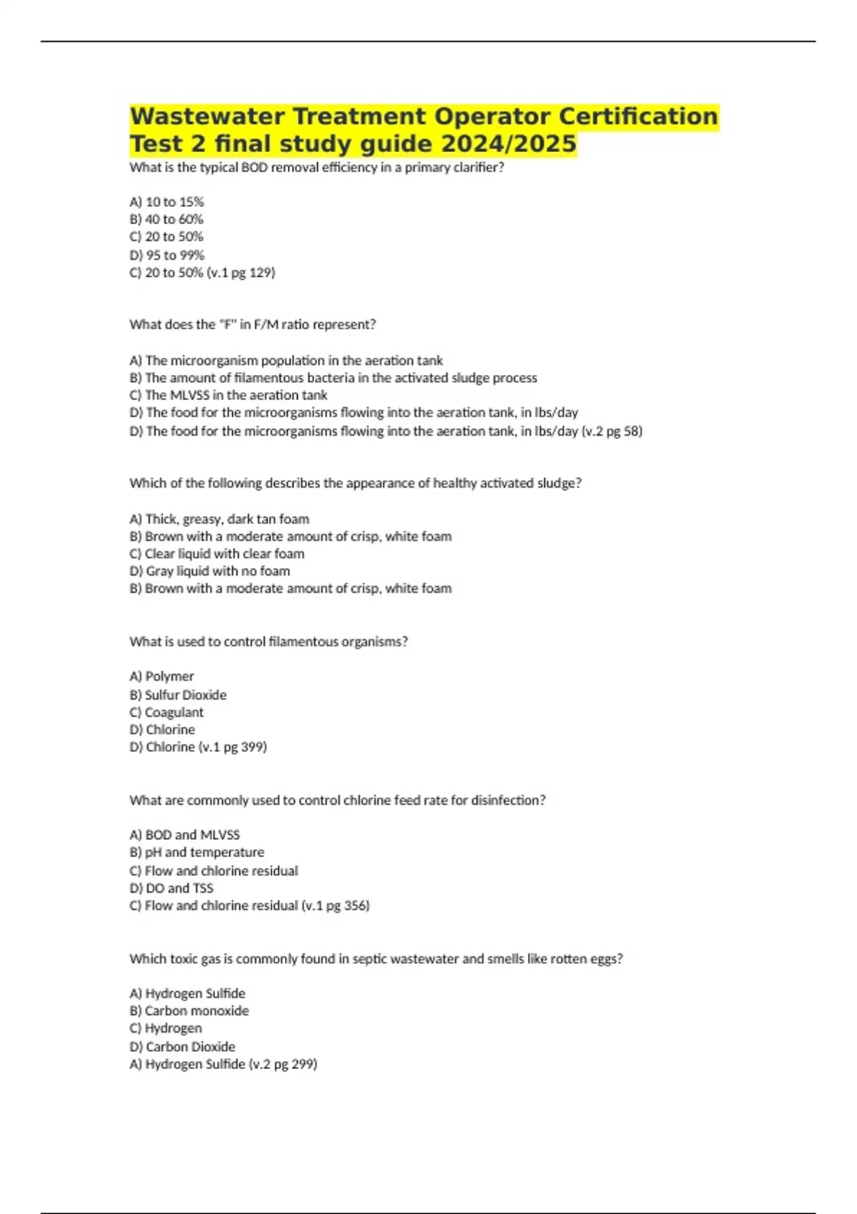 Wastewater Treatment Operator Certification Test 2 final study guide 2024/2025 What is the typical BOD removal efficiency in a primary clarifier? A) 10 to 15% B) 40 to 60% C) 20 to 50% D) 95 to 99% C) 20 to 50% (v.1 pg 129) What does the "F" in F/M ratio represent? A) The microorganism population in the aeration tank B) The amount of filamentous bacteria in the activated sludge process C) The MLVSS in the aeration tank D) The food for the microorganisms flowing into the aeration tank, in lbs/day D) The food for the microorganisms flowing into the aeration tank, in lbs/day (v.2 pg 58) Which of the following describes the appearance of healthy activated sludge? A) Thick, greasy, dark tan foam B) Brown with a moderate amount of crisp, white foam C) Clear liquid with clear foam D) Gray liquid with no foam B) Brown with a moderate amount of crisp, white foam What is used to control filamentous organisms? A) Polymer B) Sulfur Dioxide C) Coagulant D) Chlorine D) Chlorine (v.1 pg 399) What are commonly used to control chlorine feed rate for disinfection? A) BOD and MLVSS B) pH and temperature C) Flow and chlorine residual D) DO and TSS C) Flow and chlorine residual (v.1 pg 356) Which toxic gas is commonly found in septic wastewater and smells like rotten eggs? A) Hydrogen Sulfide B) Carbon monoxide C) Hydrogen D) Carbon Dioxide A) Hydrogen Sulfide (v.2 pg 299) What is the permissible exposure limit for chlorine gas vapor during a normal 8 hour workday and a 40 hour work week? A) 0.1 ppm B) 0.5 ppm C) 1 ppm D) 15 ppm B) 0.5 ppm (v.2 pg 268) What is a vulnerability assessment? A) Assesses the impact of hydrogen sulfide to a concrete structure B) Analyzes the impact of flow and infiltration problem to the plant hydraulics C) Estimates the vulnerability of aquatic wildlife to excessive algae growth D) Contingency planning to determine the vulnerability of the utility during various types of emergencies and identify corrective actions to reduce the risks D) Contingency planning to determine the vulnerability of the utility during various types of emergencies and identify corrective actions to reduce the risks (v.2 pg 722) What is the difference between the settling rate of activated sludge and raw sludge? A) Activated sludge settles slightly faster than raw sludge B) Activated sludge settles at the same rate as raw sludge C) Activated sludge settles slower than raw sludge D) Activated sludge settles much faster than raw sludge C) Activated sludge settles slower than raw sludge (v.1 pg 109) What should be mostly found in healthy activated sludge? A) Tiny flagellates B) Amoeboids C) Short Filaments D) Free swimmers and stalked ciliates D) Free swimmers and stalked ciliates (v.2 pg 120,124) One to two percent of the digester gas in an anaerobic consists of A) Hydrogen, Nitrogen, Hydrogen sulfide, and other gases B) Methane C) Carbon Dioxide D) CH_4 A) Hydrogen, Nitrogen, Hydrogen sulfide, and other gases (v.2 pg 158) What is true during the colder winter months? A) Modify operations to decrease solids under aeration to provide less microorganisms to treat the BOD B) Modify operations to increase solids under aeration to provide more microorganisms to treat the BOD C) Biological activity will increase, which results in more overall sludge production D) Microorganisms become more active B) Modify operations to increase solids under aeration to provide more microorganisms to treat the BOD (v.2 pg 71) What type of sludge would you expect in an aeration tank if the content is dark and has low DO? A) Sludge that is heavy B) Chlorinated Sludge C) Septic Sludge D) Healthy Sludge C) Septic Sludge (v.2 pg 75) What could have happen if the volatile acid/alkalinity ratio starts to increase, and corrective action is not taken immediately? A) Carbon dioxide content in the digester gas will decrease B) Carbon monoxide content in the digester gas will fluctuate C) pH of the digester sludge will increase D) Carbon dioxide content in the digester gas will increase D) Carbon dioxide content in the digester gas will increase (v.2 pg 191) What are screenings? A) Colloids B) TDS C) Pieces of wood, roots, rags, and other large debris D) COD C) Pieces of wood, roots, rags, and other large debris (v.1 pg 41) What happens when there is more food in the influent to the aeration tank? A) Less oxygen is required in the aeration tank B) More oxygen is required in the aeration tank C) Less organism activity takes place D) Less oxidation takes place B) More oxygen is required in the aeration tank (v.2 pg 19) What impact does temperature have on the reaction rate of microorganisms in wastewater? A) Reaction rate doubles with every 18 degree Fahrenheit increase in temperature until higher temperature inhibits biological activity B) Reaction rate decreases by 20% with every 10 degree Fahrenheit increase in temperature C) Reaction rate of microorganism is not impacted by temperature D) Reaction rate goes to zero A) Reaction rate doubles with every 18 degree Fahrenheit increase in temperature until higher What is commonly used to control the odor of hydrogen sulfide? A) Carbon Dioxide B) Methane C) Chlorine D) Hydrogen C) Chlorine (v.1 pg 398) What is used to determine the amount of microorganisms in the aeration tank? A) Mixed Liquor Suspended Solids (MLSS) B) Influent TSS C) BOD D) Mixed Liquor Volatile Suspended Solids (MLVSS) D) Mixed Liquor Volatile Suspended Solids (MLVSS) (v.2 pg 58) What could happen if the sludge line is isolated by closing the valves on each end for several days? A) It could result in water hammer B) Cavitation C) Gas production could increase the internal pressure and cause the line to fail D) The aerobic condition will cause Zoolgleal mass to grow in large numbers. C) Gas production could increase the internal pressure and cause the line to fail (v.2 pg 152) Which is true about chlorine gas? A) It is 2.5 times lighter than air B) it is 2.5 times heavier than air C) It is 1.5 times heavier than air D) It is 1.5 