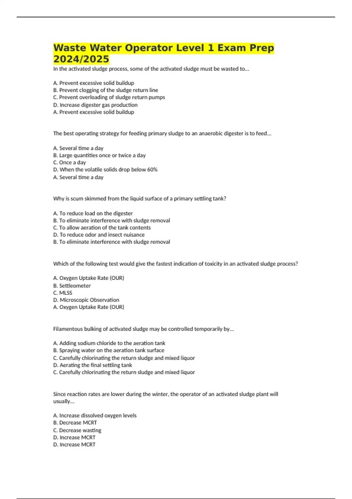 Waste Water Operator Level 1 Exam Prep 2024/2025 In the activated sludge process, some of the activated sludge must be wasted to... A. Prevent excessive solid buildup B. Prevent clogging of the sludge return line C. Prevent overloading of sludge return pumps D. Increase digester gas production A. Prevent excessive solid buildup The best operating strategy for feeding primary sludge to an anaerobic digester is to feed... A. Several time a day B. Large quantities once or twice a day C. Once a day D. When the volatile solids drop below 60% A. Several time a day Why is scum skimmed from the liquid surface of a primary settling tank? A. To reduce load on the digester B. To eliminate interference with sludge removal C. To allow aeration of the tank contents D. To reduce odor and insect nuisance B. To eliminate interference with sludge removal Which of the following test would give the fastest indication of toxicity in an activated sludge process? A. Oxygen Uptake Rate (OUR) B. Settleometer C. MLSS D. Microscopic Observation A. Oxygen Uptake Rate (OUR) Filamentous bulking of activated sludge may be controlled temporarily by... A. Adding sodium chloride to the aeration tank B. Spraying water on the aeration tank surface C. Carefully chlorinating the return sludge and mixed liquor D. Aerating the final settling tank C. Carefully chlorinating the return sludge and mixed liquor Since reaction rates are lower during the winter, the operator of an activated sludge plant will usually... A. Increase dissolved oxygen levels B. Decrease MCRT C. Decrease wasting D. Increase MCRT D. Increase MCRT In a healthy activated sludge process which of the following organisms will most likely be found in the greatest numbers? A. Stalked Ciliates B. Amoebas C. Free swimming ciliates D. Nymphs A. Stalked Ciliates Alkalinity is a measure of the ability of wastewater to... A. Neutralize base B. Neutralize acid C. Dissolve organics D. Maintain constant temperature B. Neutralize acid What is one advantage of a COD test over a BOD test? A. Shorter test time B. More accurate C. Safer D. Less chemicals needed A. Shorter test time Fecal coliform results are reported as MPN per... A. 10 mL B. 50 mL C. 100 mL D. 1,000 mL C. 100 mL A BOD can be removed from the incubator at 5 days plus of minus... A. 1 hour B. 2 hours C. 3 hours D. 4 hours C. 3 hours When performing an MPN the sample dilution is considered positive when... A. The Durham tube is found upside down B. The sample turns color from amber to brown C. No bubbles are found in the Durham tube D. Gas bubbles are found in the Durham tube D. Gas bubbles are found in the Durham tube Entrained air frequently contributes to... A. Reduced wet well capacity B. Less odor around the pump station C. Lower electrical costs D. Pump cavitation D. Pump cavitation What is the purpose of a SCADA system? A. Clean grease lines B. Justify more cleaning crews C. Control equipment and collect data D. Set collection and data appointments C. Control equipment and collect data Which of the following can cause overheating of mechanical equipment? A. Water hammer B. Under-greasing C. Over-greasing D. Dried out packing C. Over-greasing Anaerobic decomposition of wastewater produces... A. Ammonium chloride B. Hydrogen sulfide C. Carbon monoxide D. Copper sulfate B. Hydrogen sulfide Wastewater entering a treatment plant typically is... A. Somewhat warmer than tap water B. The same temp. as tap water C. Somewhat cooler than tap water D. Very cooler than tap water A. Somewhat warmer than tap water Reviewing all aspects of the wastewater treatment system to determine what would occur during various types of emergency situations is know as... A. Management effectiveness survey B. Environmental audit C. Comprehensive performance evaluation D. Vulnerability assessment D. Vulnerability assessment How much education does an operator need? A. Depends largely on the type of treatment facility and also on local certification and entry-level job requirements