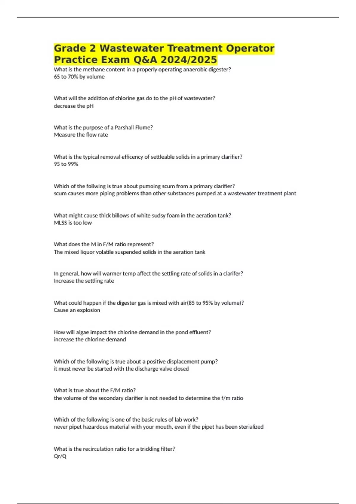 Grade 2 Wastewater Treatment Operator Practice Exam Q&A 2024/2025 What is the methane content in a properly operating anaerobic digester? 65 to 70% by volume What will the addition of chlorine gas do to the pH of wastewater? decrease the pH What is the purpose of a Parshall Flume? Measure the flow rate What is the typical removal efficency of settleable solids in a primary clarifier? 95 to 99% Which of the follwing is true about pumoing scum from a primary clarifier? scum causes more piping problems than other substances pumped at a wastewater treatment plant What might cause thick billows of white sudsy foam in the aeration tank? MLSS is too low What does the M in F/M ratio represent? The mixed liquor volatile suspended solids in the aeration tank In general, how will warmer temp affect the settling rate of solids in a clarifer? Increase the settling rate What could happen if the digester gas is mixed with air(85 to 95% by volume)? Cause an explosion How will algae impact the chlorine demand in the pond effluent? increase the chlorine demand Which of the following is true about a positive displacement pump? it must never be started with the discharge valve closed What is true about the F/M ratio? the volume of the secondary clarifier is not needed to determine the f/m ratio Which of the following is one of the basic rules of lab work? never pipet hazardous material with your mouth, even if the pipet has been sterialized What is the recirculation ratio for a trickling filter? Qr/Q Which of the following is true about COD and BOD? they are indirect measurements of the organic content in the influent What is the purpose of the grit channel? remove heavy inorganic waste Which of the following is true about the extended aeration process? it does not produce as much waste sludge as other processes What is the correct formula for solids in raw wastewater? Non settleable solids + settleable solids = total suspended solids What is freeboard in a waste stabilization pond? the vertical distance from normal water surface to the top of the levee What is one of the requirements for a BOD test? The BOD bottle should be completely filled to the top What should be scheduled every 3 months for a flamer arrester in an anaerobic digester? maintenance What is common practice in an activated sludge process? recirculate activated sludge Prior to entering a permit-required confined space, what should you verify? a standby person should be located outside the entrance to the confined space, while another person should be within sight or call of the standby person What is a common way to determine the organic strength of wastes in the influent? test for the biochemical oxygen demand What should you do if you are mildly exposed to chlorine gas? immediately evacuate the contaminated area, remian calm, keep warm. breath lightly, avoid coughing What are the main sources of domestic sewage in the collection system? household and commercial establishments Why is it important to maintain a horizontal weir in a clarifier? to prevent short circuiting What are mostly removed in the grit channel?