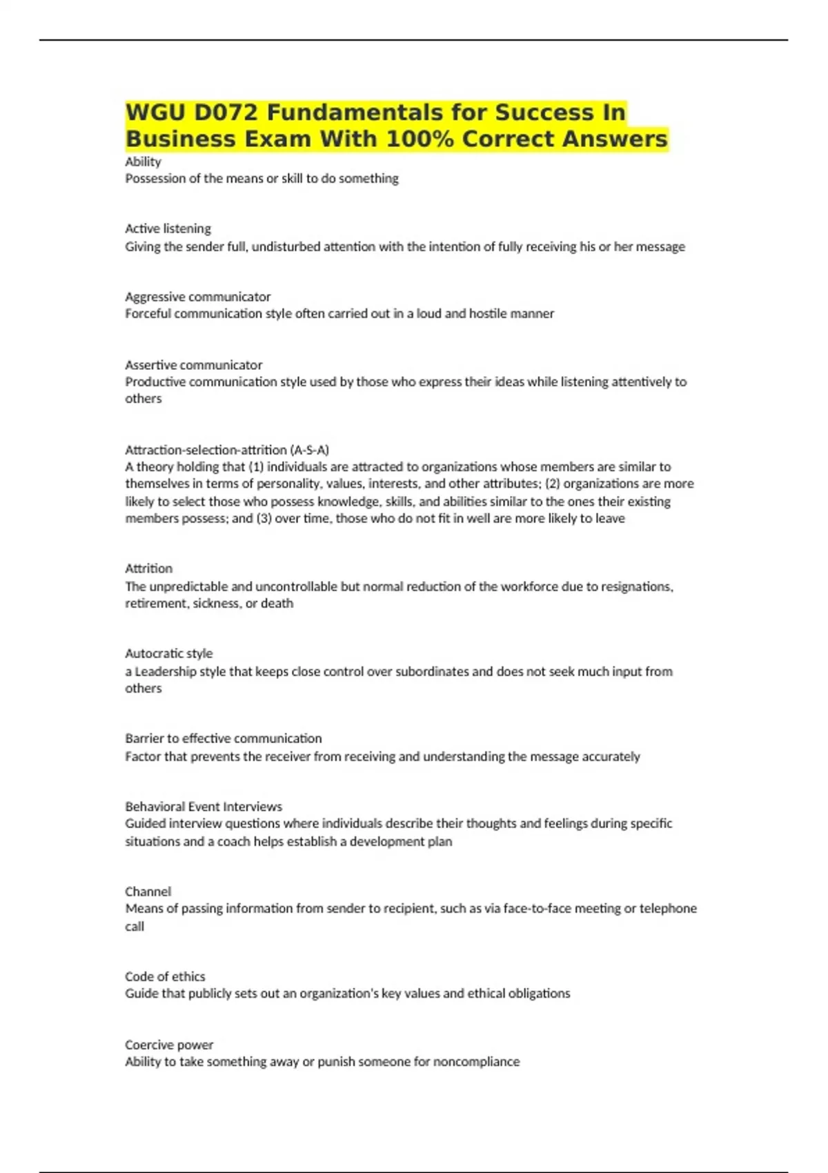 WGU D072 Fundamentals for Success In Business Exam With 100% Correct Answers Ability Possession of the means or skill to do something Active listening Giving the sender full, undisturbed attention with the intention of fully receiving his or her message Aggressive communicator Forceful communication style often carried out in a loud and hostile manner Assertive communicator Productive communication style used by those who express their ideas while listening attentively to others Attraction-selection-attrition (A-S-A) A theory holding that (1) individuals are attracted to organizations whose members are similar to themselves in terms of personality, values, interests, and other attributes; (2) organizations are more likely to select those who possess knowledge, skills, and abilities similar to the ones their existing members possess; and (3) over time, those who do not fit in well are more likely to leave Attrition The unpredictable and uncontrollable but normal reduction of the workforce due to resignations, retirement, sickness, or death Autocratic style a Leadership style that keeps close control over subordinates and does not seek much input from others Barrier to effective communication Factor that prevents the receiver from receiving and understanding the message accurately Behavioral Event Interviews Guided interview questions where individuals describe their thoughts and feelings during specific situations and a coach helps establish a development plan Channel Means of passing information from sender to recipient, such as via face-to-face meeting or telephone call Code of ethics Guide that publicly sets out an organization's key values and ethical obligations Coercive power Ability to take something away or punish someone for noncompliance Communication Sharing understanding and meaning via oral, nonverbal, and written forms Communication style Dominant way in which an individual interacts and exchanges information with others Consideration The relationship-oriented behaviors of a leader Corporate culture The attitudes, values, and standards of behavior that distinguishes one organization from another Corporate social responsibility (CSR) Philosophy in which a company voluntarily engages in actions that benefit society, be it economically, socially, politically, or environmentally Cultural alignment Linking of organizational goals with the employees' personal goals Cultural diversity The existence of a variety of cultural or ethnic groups within a workplace CVF model Framework for assessing organizational culture and organizational dynamics Design thinking A method of problem-solving strategy wherein the data collected are expressed visually in order to create new strategies, ways, and methods to solve problems, create opportunities or strengthen weaknesses Effective communication When information transmitted is interpreted by the receiver in the way it was intended by the sender Emotional intelligence The capacity to be aware of, control, and express one's emotions, and to handle interpersonal relationships judiciously and empathetically Emotional quotient The level of a person's emotional intelligence, often as represented by a score in a standardized test Empathy Being attuned and sensitive to the emotional states of others Employee-member-centered behaviors Behaviors that focus on supporting employees EQ The level of a person's emotional intelligence, often as represented by a score in a standardized test Ethics Principles that serve as a guide about how to behave Expert power Power based on knowledge and special skill or experience Formal leaders A person who is officially designated as the leader of a group Greenwashing When organizations carry about CSR missions in an inauthentic way, using them to increase publicity rather than to spur real change Idealized influence Form of transformational leadership in which a leader models behaviors and attitude that subordinates choose to emulate Illegal-ethical Dilemma in which the ethical choice would be in violation of established laws Individual contributor An individual contributor is someone uses their personal skills to contributes to a team Individualized consideration Form of transformational leadership in which a leader takes the time to learn about the talents of each individual and puts them to good use Influence tactics The way individuals attempt to influence one another in organizations Informal leaders A person who is not officially appointed as the head of a group Information power Power that stems from when a leader possesses knowledge that others need or want Initiating