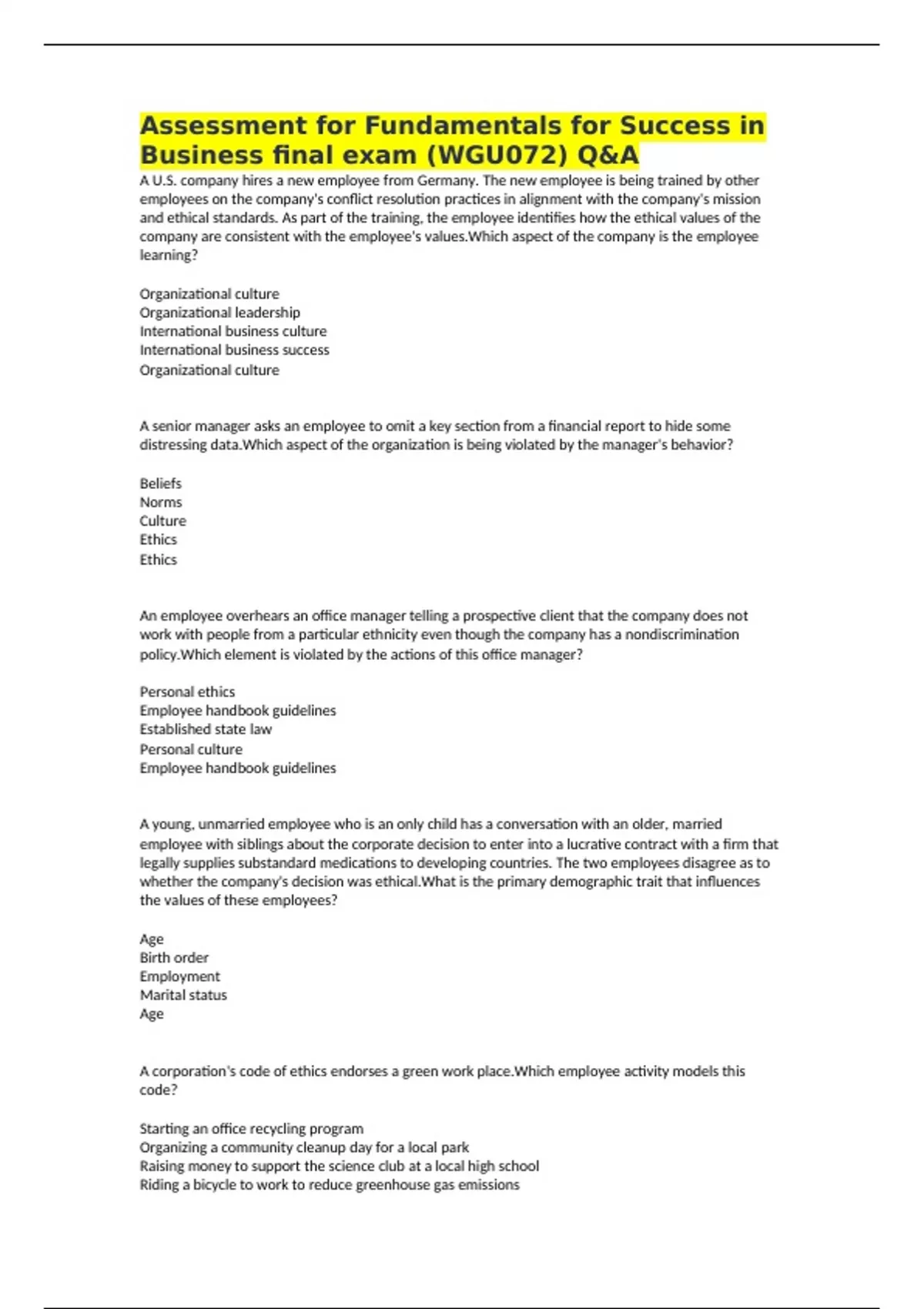 Assessment for Fundamentals for Success in Business final exam (WGU072) Q&A A U.S. company hires a new employee from Germany. The new employee is being trained by other employees on the company's conflict resolution practices in alignment with the company's mission and ethical standards. As part of the training, the employee identifies how the ethical values of the company are consistent with the employee's values.Which aspect of the company is the employee learning? Organizational culture Organizational leadership International business culture International business success Organizational culture A senior manager asks an employee to omit a key section from a financial report to hide some distressing data.Which aspect of the organization is being violated by the manager's behavior? Beliefs Norms Culture Ethics Ethics An employee overhears an office manager telling a prospective client that the company does not work with people from a particular ethnicity even though the company has a nondiscrimination policy.Which element is violated by the actions of this office manager? Personal ethics Employee handbook guidelines Established state law Personal culture Employee handbook guidelines A young, unmarried employee who is an only child has a conversation with an older, married employee with siblings about the corporate decision to enter into a lucrative contract with a firm that legally supplies substandard medications to developing countries. The two employees disagree as to whether the company's decision was ethical.What is the primary demographic trait that influences the values of these employees? Age Birth order Employment Marital status Age A corporation's code of ethics endorses a green work place.Which employee activity models this code? Starting an office recycling program Organizing a community cleanup day for a local park Raising money to support the science club at a local high school Riding a bicycle to work to reduce greenhouse gas emissions Starting an office recycling program A company advertises that it uses environmentally safe practices in all business processes; however, the chief financial officer (CFO) has blocked the adoption of many environmentally safe practices because of the additional costs to the company.Which controversial business practice is this company using? Whistleblowing Sheltering Greenwashing Cherry picking Greenwashing An organization plans to close its local factory and shift manufacturing operations overseas. This brings opposition from employees.Which terms describes this organizational move? Legal-ethical Legal-unethical Illegal-ethical Illegal-unethical Legal-ethical Individual authors wrote books about the negative environmental impacts of some industries, including the coal industry.Which benefit did the authors' work have on society? It helped the authors to become more popular. It drew the public's attention to the targeted issue. It increased the economic welfare of the community. It resulted in increased government funding for the industries. It drew the public's attention to the targeted issue. The accountant of a company was asked to change the current quarterly sales results by adding sales that were set to occur next quarter.Which stakeholder group is directly impacted by this action? Suppliers Employees Customers Shareholders Shareholders A new manager in a restaurant decides to cut costs by purchasing sub-standard materials. What are the implications of this manager's actions? The customer base of the restaurant will decrease. The employee morale will improve. The menu prices will be reduced. The reputation of the restaurant will increase. The customer base of the restaurant will decrease. Which type of organizational culture in the Competing Values Framework focuses on accountability to shareholders, competitiveness, and productivity? Adhocracy Clan Hierarchy Market Market Which pair of attributes captures the focus of an adhocracy culture within the competing values framework? People-oriented and friendly Adjustable and entrepreneurial Results-oriented and competitive Process-oriented and highly structured Adjustable and entrepreneurial Which set of attributes reflects a hierarchy culture within the Competing Values Framework? People-oriented and friendly Adjustable and entrepreneurial Results-oriented and competitive Process-oriented and highly structured Process-oriented and highly structured A nonprofit organization wants to fill an executive director position and is interested in seeking a candidate that is concerned about social welfare.Which criterion should the organization prioritize in making this decision? Military experience Competition for top grades Dedication to community service Graduation from a university Dedication to community service An individual who values a team-oriented work environment and the individual's relationships with a large group of peers is seeking employment that will be a good fit.Which position should this individual pursue? A position that has high visibility A position that requires high responsibility A position that provides a large salary A position that offers a friendly workplace A position that offers a friendly workplace An individual who is a great performer has been working in a department in a company for over ten years and is moved to a new department and given a new set of job responsibilities. The individual is unhappy in the new location and has started to underperform.Which issue has emerged for this employee? Attrition Attraction Person-job fit Person-organization fit Person-job fit A person that is high in sociability and friendliness is required for a sales job. Which component of personality should be high in the ideal candidate? Openness Neuroticism Extraversion Conscientiousness Extraversion Which organizational culture is best suited for an individual who is high in conscientiousness? Clan Market Hierarchy Adhocracy Hierarchy Which individual characteristic should a compan
