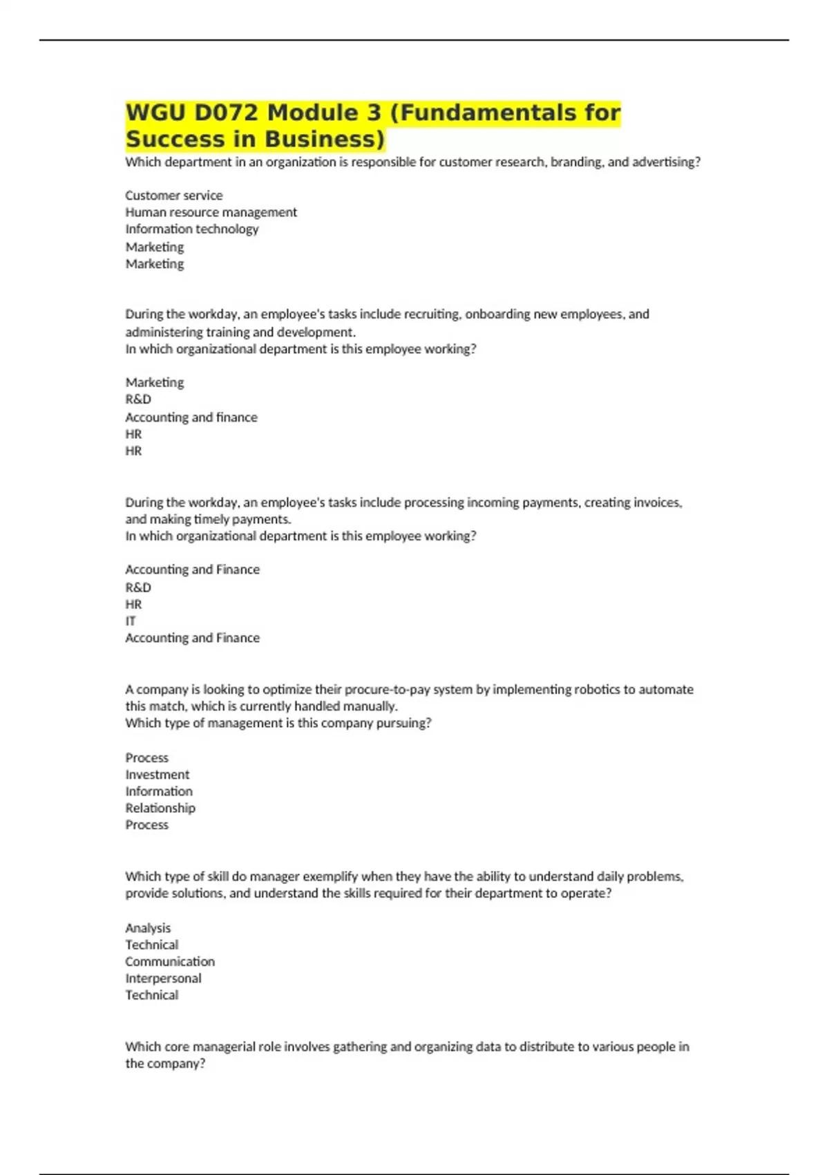 WGU D072 Module 3 (Fundamentals for Success in Business) Which department in an organization is responsible for customer research, branding, and advertising? Customer service Human resource management Information technology Marketing Marketing During the workday, an employee's tasks include recruiting, onboarding new employees, and administering training and development. In which organizational department is this employee working? Marketing R&D Accounting and finance HR HR During the workday, an employee's tasks include processing incoming payments, creating invoices, and making timely payments. In which organizational department is this employee working? Accounting and Finance R&D HR IT Accounting and Finance A company is looking to optimize their procure-to-pay system by implementing robotics to automate this match, which is currently handled manually. Which type of management is this company pursuing? Process Investment Information Relationship Process Which type of skill do manager exemplify when they have the ability to understand daily problems, provide solutions, and understand the skills required for their department to operate? Analysis Technical Communication Interpersonal Technical Which core managerial role involves gathering and organizing data to distribute to various people in the company?