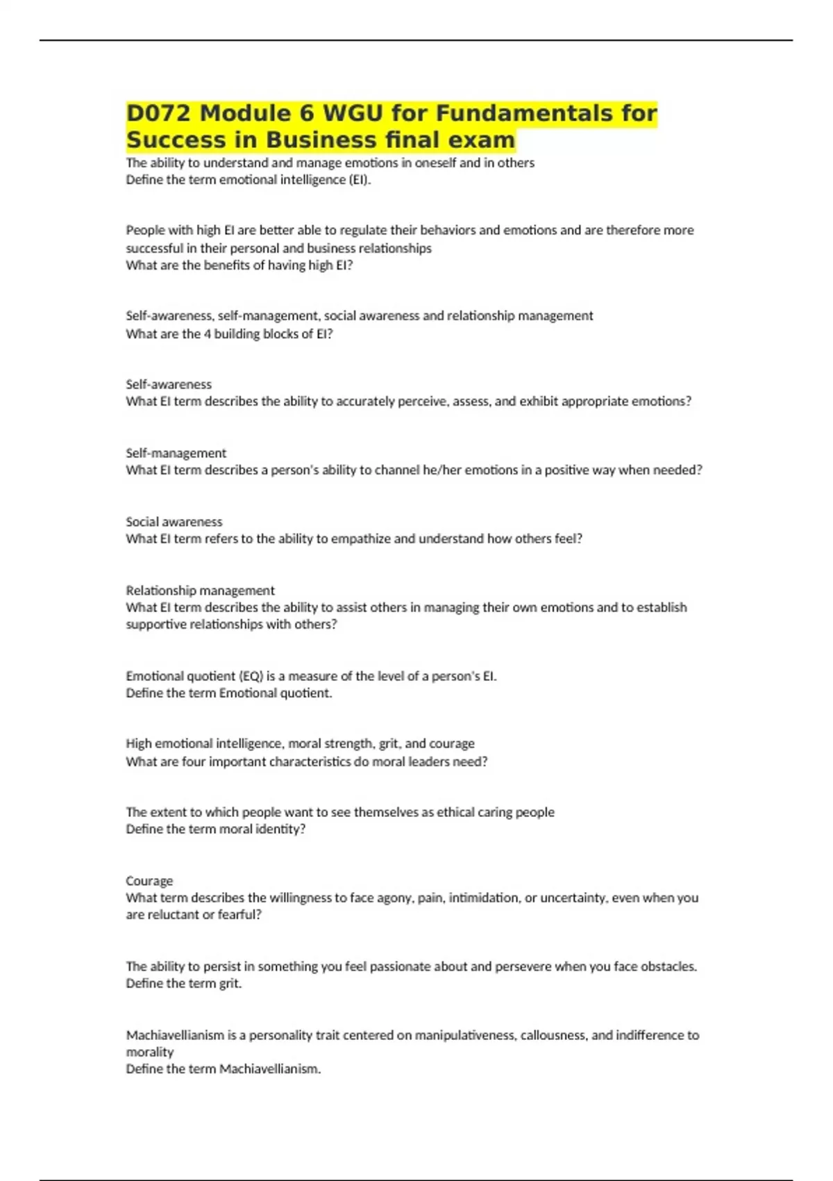 D072 Module 6 WGU for Fundamentals for Success in Business final exam The ability to understand and manage emotions in oneself and in others Define the term emotional intelligence (EI). People with high EI are better able to regulate their behaviors and emotions and are therefore more successful in their personal and business relationships What are the benefits of having high EI? Self-awareness, self-management, social awareness and relationship management What are the 4 building blocks of EI? Self-awareness What EI term describes the ability to accurately perceive, assess, and exhibit appropriate emotions? Self-management What EI term describes a person's ability to channel he/her emotions in a positive way when needed? Social awareness What EI term refers to the ability to empathize and understand how others feel? Relationship management What EI term describes the ability to assist others in managing their own emotions and to establish supportive relationships with others? Emotional quotient (EQ) is a measure of the level of a person's EI. Define the term Emotional quotient. High emotional intelligence, moral strength, grit, and courage What are four important characteristics do moral leaders need? The extent to which people want to see themselves as ethical caring people Define the term moral identity? Courage What term describes the willingness to face agony, pain, intimidation, or uncertainty, even when you are reluctant or fearful? The ability to persist in something you feel passionate about and persevere when you face obstacles. Define the term grit. Machiavellianism is a personality trait centered on manipulativeness, callousness, and indifference to morality Define the term Machiavellianism.