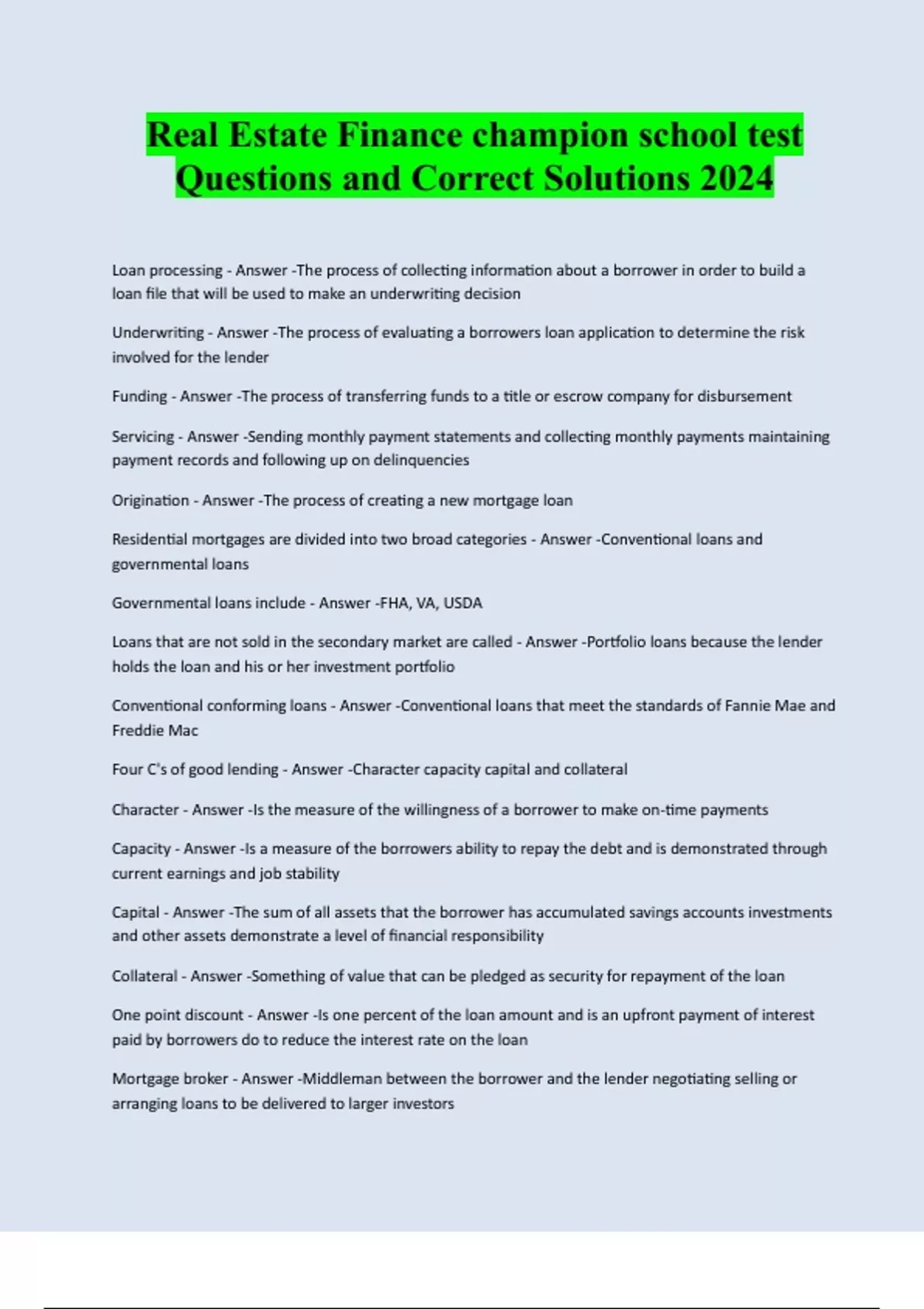 Real Estate Finance champion school test Questions and Correct Solutions 2024