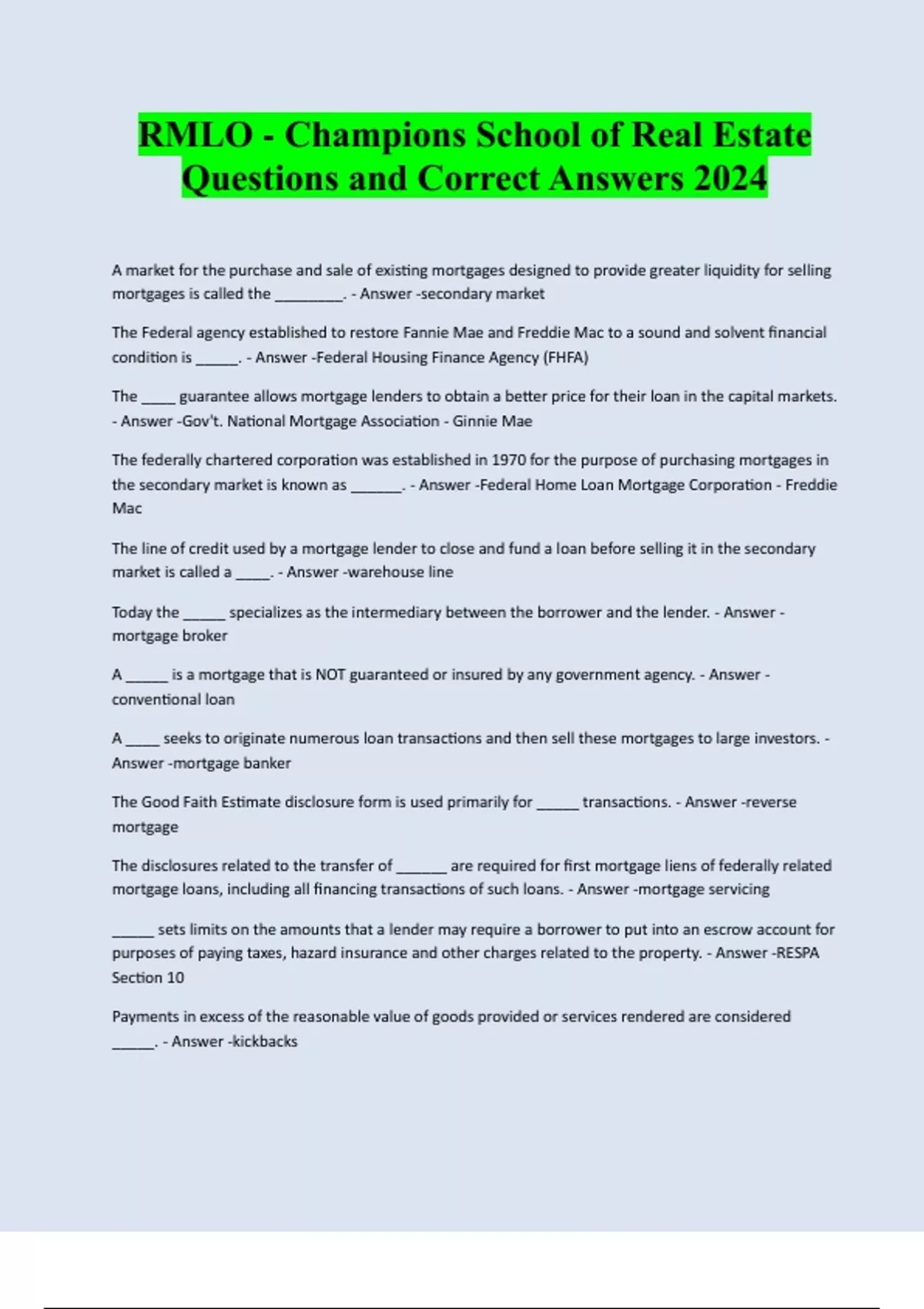 RMLO - Champions School of Real Estate Questions and Correct Answers 2024