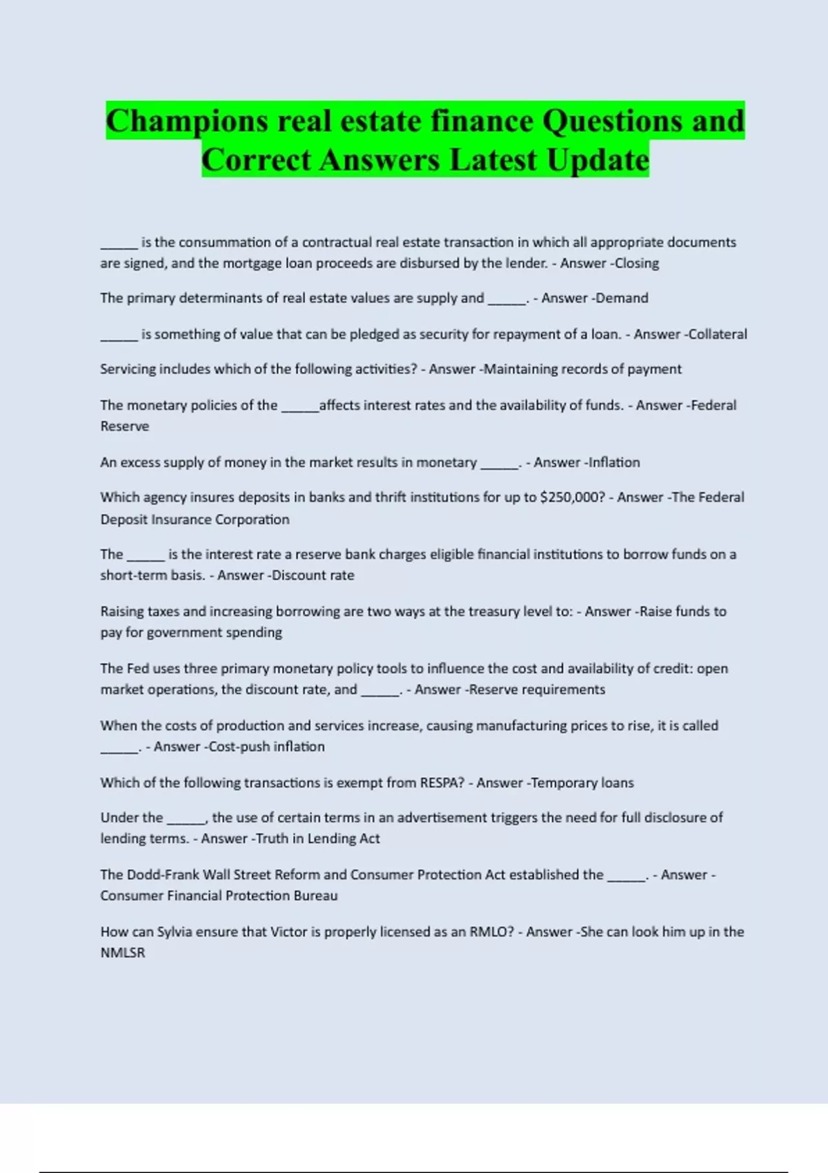 Champions real estate finance Questions and Correct Answers Latest Update _____ is the consummation of a contractual real estate transaction in which all appropriate documents are signed, and the mortgage loan proceeds are disbursed by the lender. - Answer -Closing The primary determinants of real estate values are supply and _____. - Answer -Demand _____ is something of value that can be pledged as security for repayment of a loan. - Answer -Collateral Servicing includes which of the following activities? - Answer -Maintaining records of payment The monetary policies of the _____affects interest rates and the availability of funds. - Answer -Federal Reserve An excess supply of money in the market results in monetary _____. - Answer -Inflation Which agency insures deposits in banks and thrift institutions for up to $250,000? - Answer -The Federal Deposit Insurance Corporation The _____ is the interest rate a reserve bank charges eligible financial institutions to borrow funds on a short-term basis. - Answer -Discount rate Raising taxes and increasing borrowing are two ways at the treasury level to: - Answer -Raise funds to pay for government spending The Fed uses three primary monetary policy tools to influence the cost and availability of credit: open market operations, the discount rate, and _____. - Answer -Reserve requirements When the costs of production and services increase, causing manufacturing prices to rise, it is called _____. - Answer -Cost-push inflation Which of the following transactions is exempt from RESPA? - Answer -Temporary loans Under the _____, the use of certain terms in an advertisement triggers the need for full disclosure of lending terms. - Answer -Truth in Lending Act The Dodd-Frank Wall Street Reform and Consumer Protection Act established the _____. - Answer - Consumer Financial Protection Bureau How can Sylvia ensure that Victor is properly licensed as an RMLO? - Answer -She can look him up in the NMLSRThe secondary mortgage market was designed to provide greater liquidity to the residential real estate market, primarily by _____. - Answer -The sale of mortgage loans as investments Loans originated to adhere to Fannie Mae, Freddie Mac, and Ginnie Mae requirements for purchase are called _____. - Answer -Conforming loans Which of the following housing objectives does Fannie Mae address? - Answer -Regional imbalances of available mortgage credit, The origin