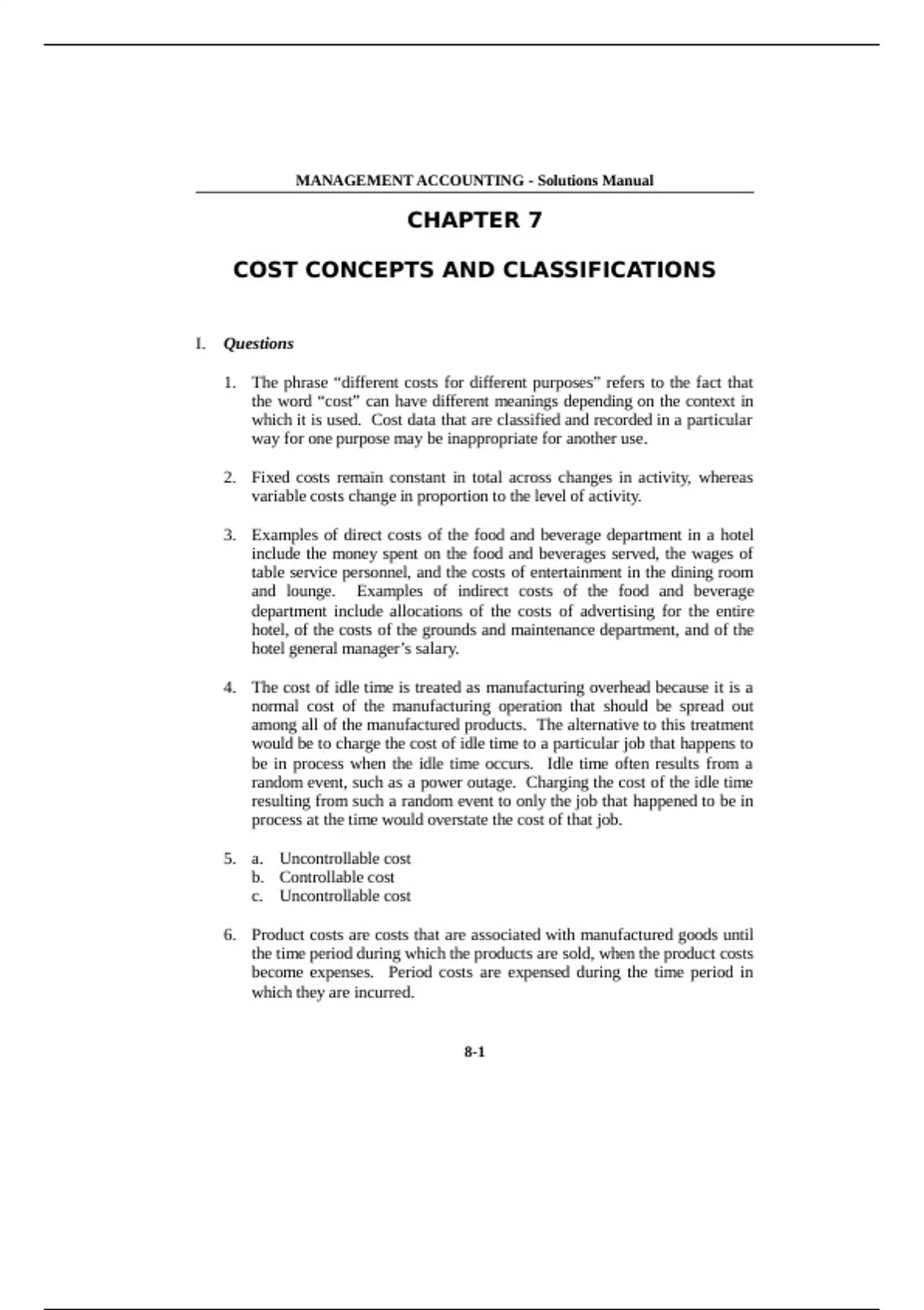 MANAGEMENT ACCOUNTING - Solutions Manual CHAPTER 7 COST CONCEPTS AND CLASSIFICATIONS I. Questions 1. The phrase “different costs for different purposes” refers to the fact that the word “cost” can have different meanings depending on the context in which it is used. Cost data that are classified and recorded in a particular way for one purpose may be inappropriate for another use. 2. Fixed costs remain constant in total across changes in activity, whereas variable costs change in proportion to the level of activity. 3. Examples of direct costs of the food and beverage department in a hotel include the money spent on the food and beverages served, the wages of table service personnel, and the costs of entertainment in the dining room and lounge. Examples of indirect costs of the food and beverage department include allocations of the costs of advertising for the entire hotel, of the costs of the grounds and maintenance department, and of the hotel general manager’s salary. 4. The cost of idle time is treated as manufacturing overhead because it is a normal cost of the manufacturing operation that should be spread out among all of the manufactured