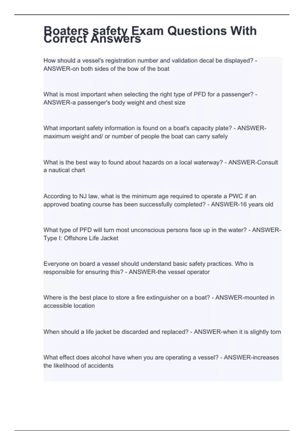 Boaters safety Exam Questions With Correct Answers