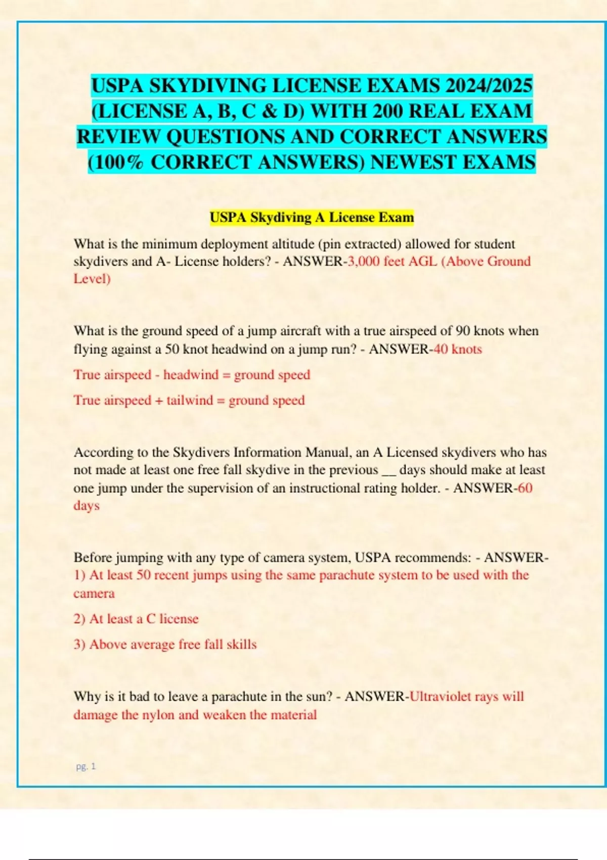 USPA SKYDIVING LICENSE EXAMS 2024/2025 (LICENSE A, B, C & D) WITH 200 REAL EXAM REVIEW QUESTIONS AND CORRECT ANSWERS (100% CORRECT ANSWERS) NEWEST EXAMS