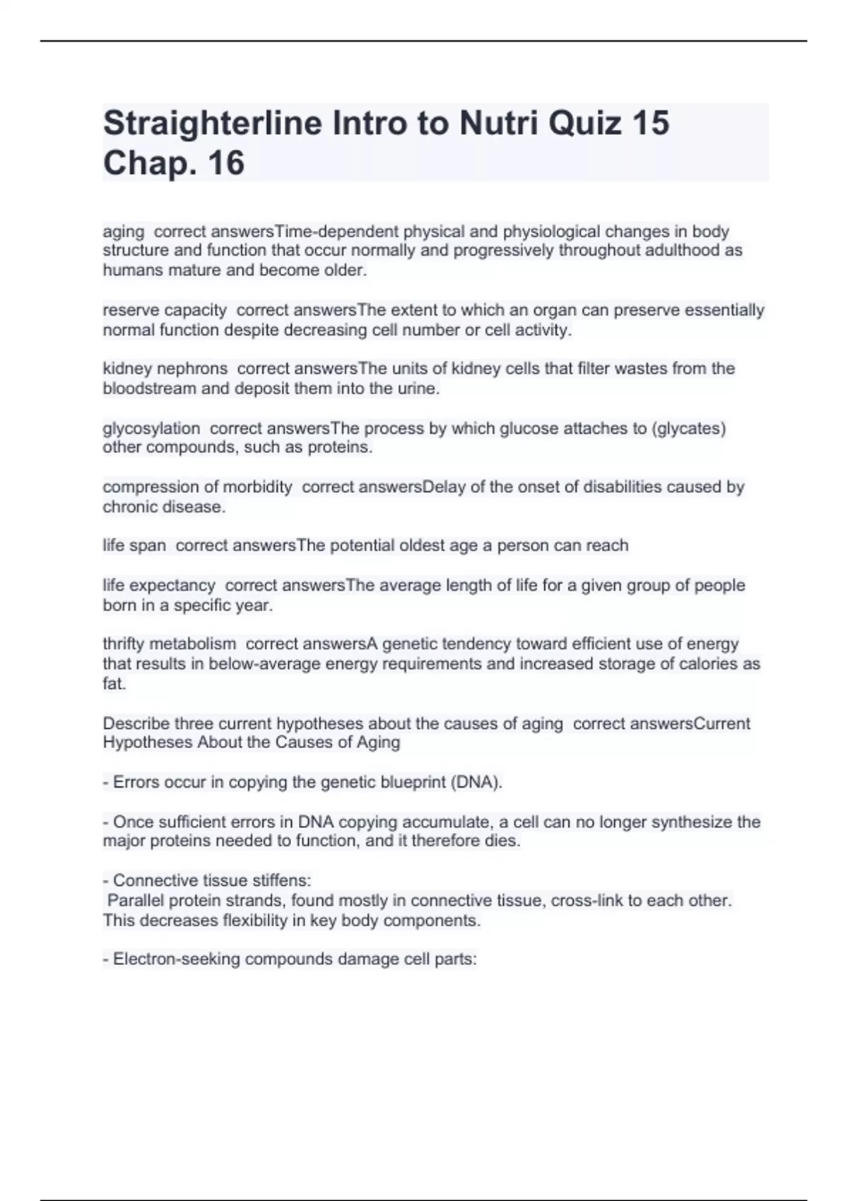 aging correct answersTime-dependent physical and physiological changes in body structure and function that occur normally and progressively throughout adulthood as humans mature and become older. reserve capacity correct answersThe extent to which an organ can preserve essentially normal function despite decreasing cell number or cell activity. kidney nephrons correct answersThe units of kidney cells that filter wastes from the bloodstream and deposit them into the urine. glycosylation correct answersThe process by which glucose attaches to (glycates) other compounds, such as proteins. compression of morbidity correct answersDelay of the onset of disabilities caused by chronic disease. life span correct answersThe potential oldest age a person can reach life expectancy correct answersThe average length of life for a given group of people born in a specific year. thrifty metabolism correct answersA genetic tendency toward efficient use of energy that results in below-average energy requirements and increased storage of calories as fat. Describe three current hypotheses about the causes of aging correct answersCurrent Hypotheses About the Causes of Aging - Errors occur in copying the genetic blueprint (DNA). - Once sufficient errors in DNA copying accumulate, a cell can no longer synthesize the major proteins needed to function, and it therefore dies. - Connective tissue stiffens: Parallel protein strands, found mostly in connective tissue, cross-link to each other. This decreases flexibility in key body components. - Electron-seeking compounds damage cell parts: