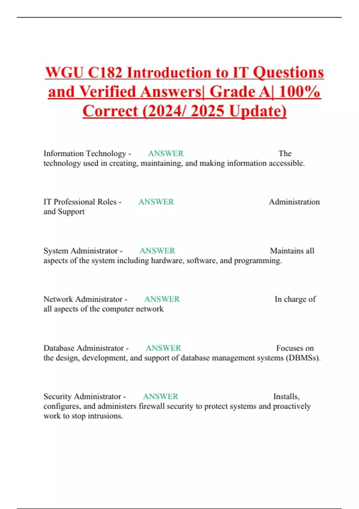 WGU C182 Introduction to IT Questions and Verified Answers| Grade A| 100% Correct (2024/ 2025 Update) Information Technology - ANSWER The technology used in creating, maintaining, and making information accessible. IT Professional Roles - ANSWER Administration and Support System Administrator - ANSWER Maintains all aspects of the system including hardware, software, and programming. Network Administrator - ANSWER In charge of all aspects of the computer network Database Administrator - ANSWER Focuses on the design, development, and support of database management systems (DBMSs). Security Administrator - ANSWER Installs, configures, and administers firewall security to protect systems and proactively work to stop intrusions.