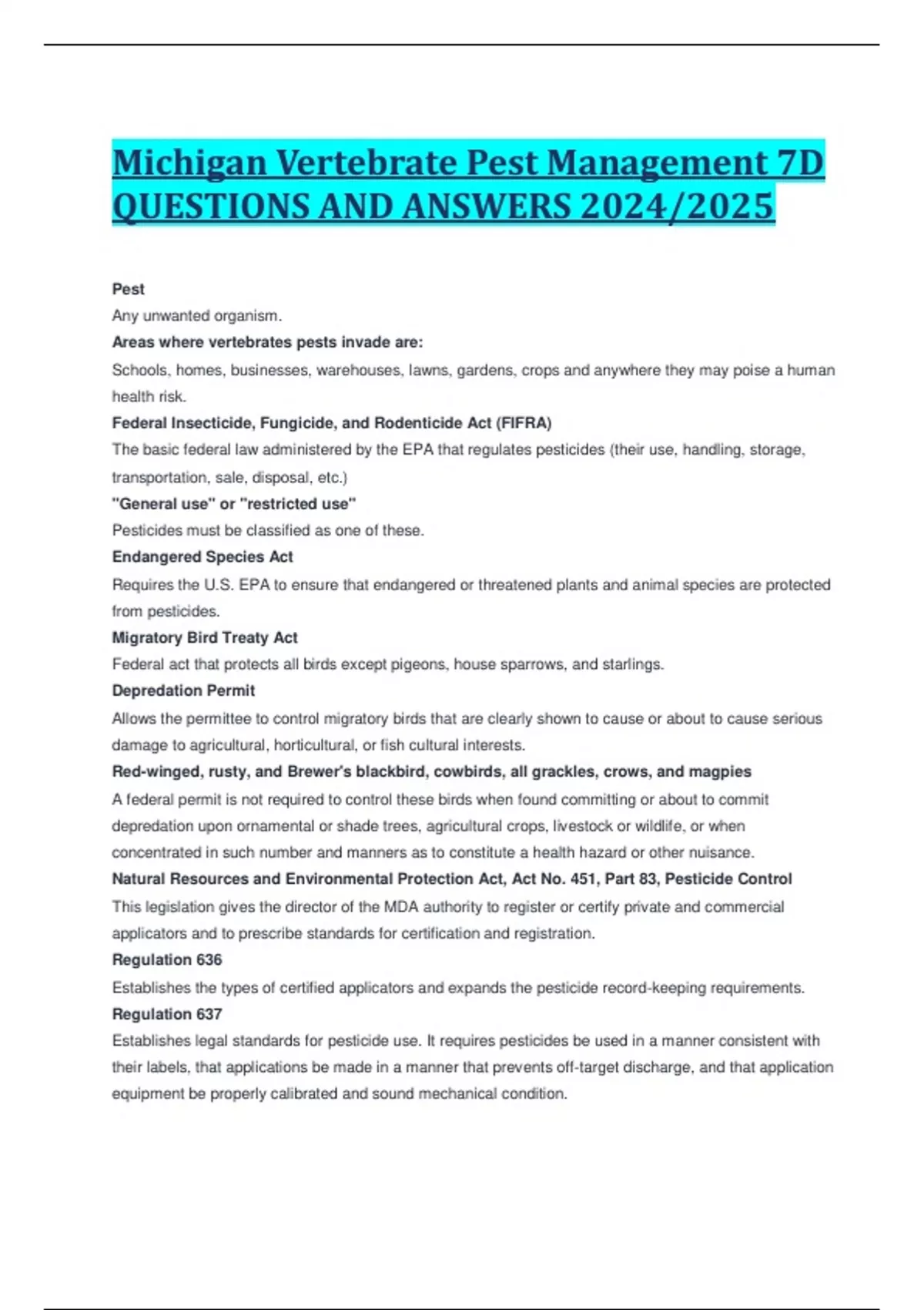 Michigan Vertebrate Pest Management 7D QUESTIONS AND ANSWERS 2024/2025