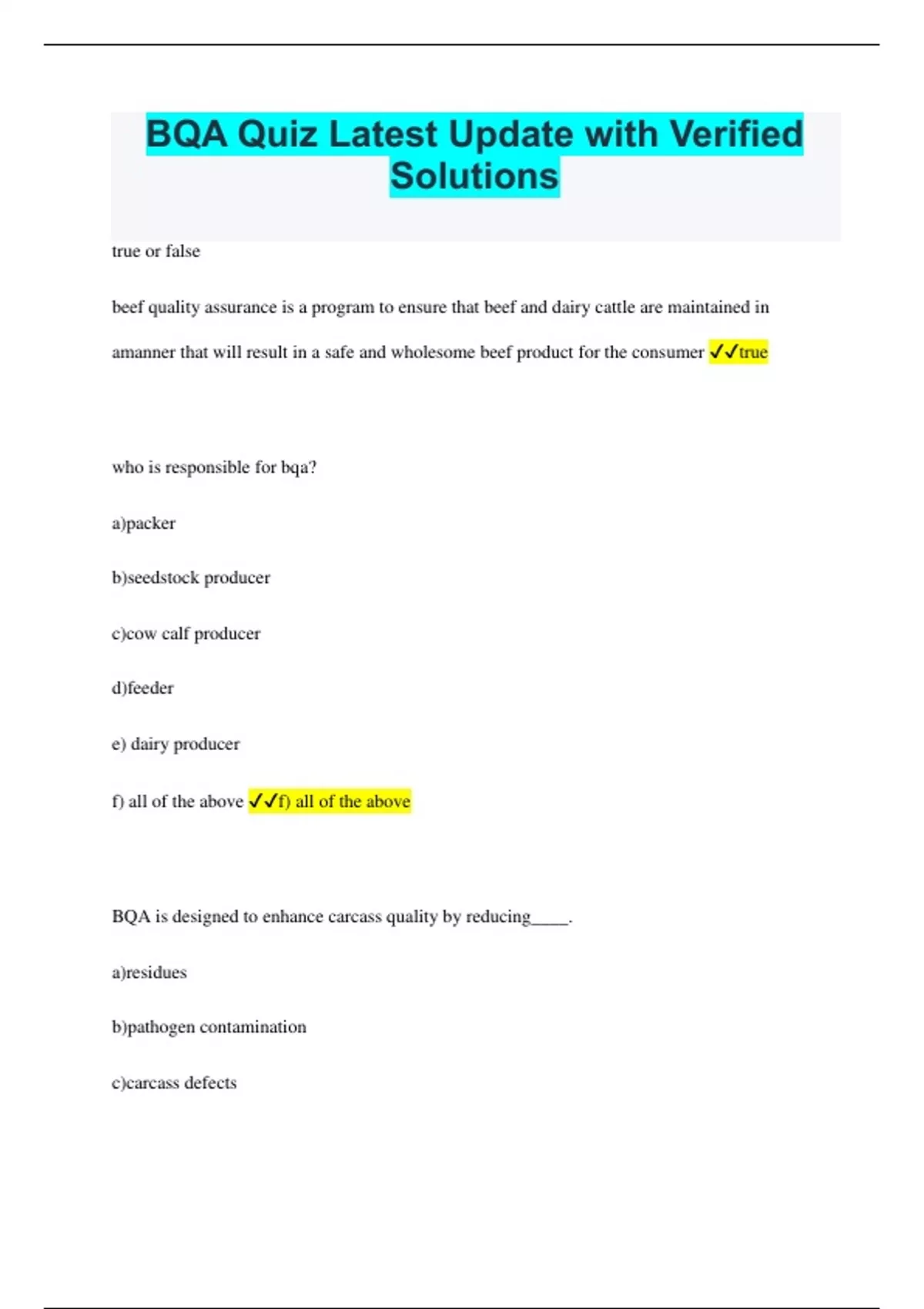 BQA Quiz Latest Update with Verified Solutions true or false beef quality assurance is a program to ensure that beef and dairy cattle are maintained in amanner that will result in a safe and wholesome beef product for the consumer true who is responsible for bqa? a)packer b)seedstock producer c)cow calf producer d)feeder e) dairy producer f) all of the above f) all of the above BQA is designed to enhance carcass quality by reducing____. a)residues b)pathogen contamination c)carcass defects d) all of the above d) all of the above true or false currently, the Ohio BQA is a voluntary program true bruising from improper cattle handling is not considered a major economic loss to the beef cattle industry. false people who push cattle through a corral the fastest will most likely a)cause less bruising b)cause more bruising c)cause more animal stress d)cause less animal stress e) a&d f) b&c F) b&c what should you see in animal treatment records? animal, group or lot number date treated dosage product used and lot/ serial number true or false: using animal health products exactly as they are labeled or prescribed and having a veterinarian-client-patient-relationship is required for a BQA program true most residue violations can be reduced by: a)placing all injections in the neck b)identification of animals c)selling cattle on a grid d) following directions d) following directions true or false A VCPR is not required for extra label use false if a product is used extra label