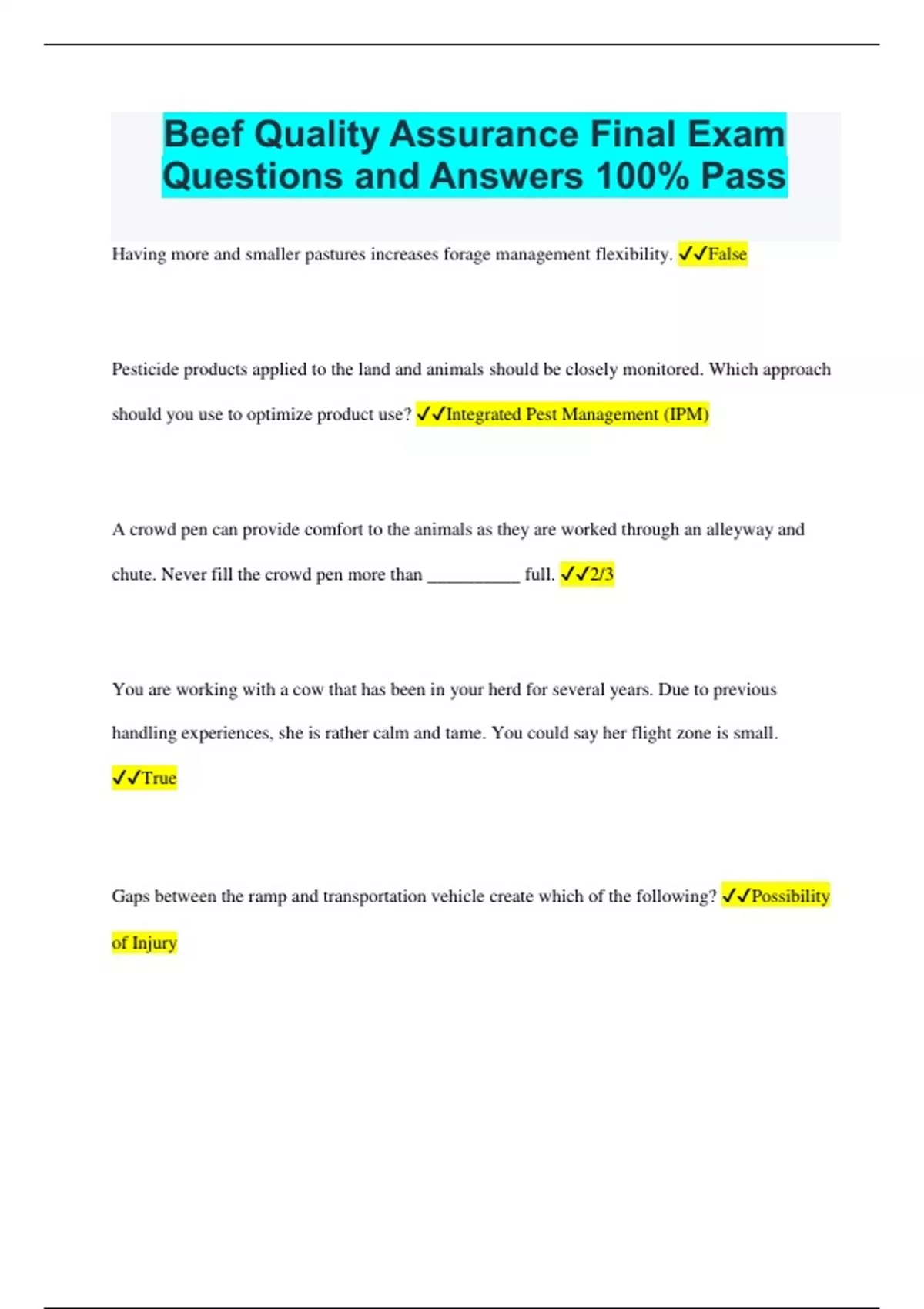 Beef Quality Assurance Final Exam Questions and Answers 100% Pass Having more and smaller pastures increases forage management flexibility. False Pesticide products applied to the land and animals should be closely monitored. Which approach should you use to optimize product use? Integrated Pest Management (IPM) A crowd pen can provide comfort to the animals as they are worked through an alleyway and chute. Never fill the crowd pen more than __________ full. 2/3 You are working with a cow that has been in your herd for several years. Due to previous handling experiences, she is rather calm and tame. You could say her flight zone is small. True Gaps between the ramp and transportation vehicle create which of the following? Possibility of Injury Once cattle are loaded, it is the drivers responsibility to Ensure a successful delivery, including specific drop off locations, drop off times, head counts, and unloading instructions. At the same time, the owner is no longer responsible for the animals. False Mud accumulation on cattle should be monitored as it is a measure of pasture/pen condition. True Branding serves as a permanent identification method for animals. Brands should be placed before calves reach which age? Three Months You've recently purchased three newborn calves from your neighbor to foster on to animals in your heard that have lost their calves. You notice the newly purchased calves have scours, and begin to treat them immediately. Which record what do you use to record this treatment. Pesticide use record Expiration dates are irrelevant in animal vaccines. False You see an advertisement for a group of commercial cows for sale from a local ranch. You are interested in buying the group, but would like to assess their Body Condition Score (BCS) in person. The Body Condition Score is a useful method to determine the nutritional status of an animal by evaluating and estimating body ______ and ________ fat and muscling You are preparing to fence line wean your calves. The veterinarian suggested you use preconditioning techniques to minimize stress in the