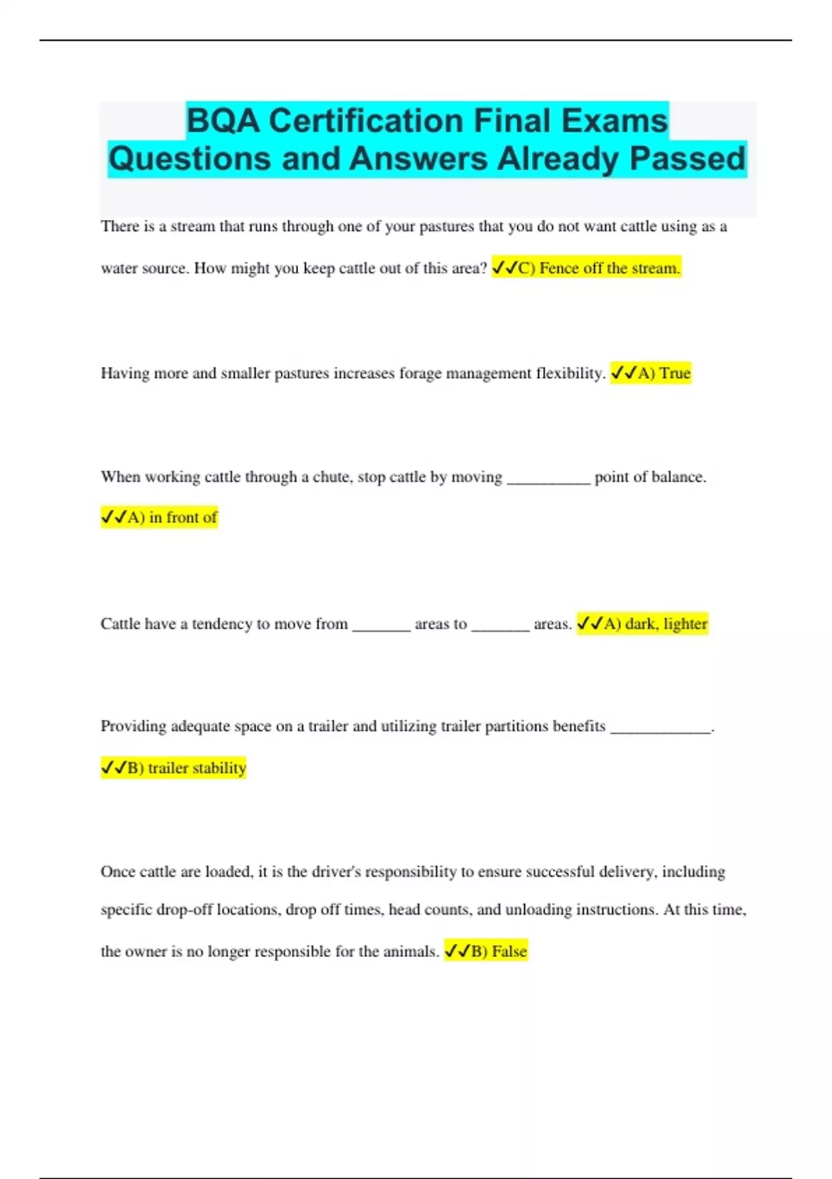 BQA Certification Final Exams Questions and Answers Already Passed There is a stream that runs through one of your pastures that you do not want cattle using as a water source. How might you keep cattle out of this area? C) Fence off the stream. Having more and smaller pastures increases forage management flexibility. A) True When working cattle through a chute, stop cattle by moving __________ point of balance. A) in front of Cattle have a tendency to move from _______ areas to _______ areas. A) dark, lighter Providing adequate space on a trailer and utilizing trailer partitions benefits ____________. B) trailer stability Once cattle are loaded, it is the driver's responsibility to ensure successful delivery, including specific drop-off locations, drop off times, head counts, and unloading instructions. At this time, the owner is no longer responsible for the animals. B) False The _______ of a pen should facilitate proper drainage such that water runs away from the feed bunks and does not pool. C) slope Expiration dates are irrelevant in animal vaccines. B) False What elements of the animal's health record should be transferred with the animal to the next production unit? D) A complete history including all of the above You've recently purchased three newborn calves from your neighbor to foster onto animals in your herd that have lost their calves. You notice the newly purchased calves have scours, and begin to treat them immediately. Which record will you use to record this treatment? D) Animal health record Food additives can be an efficient way to administer antibiotics to an entire herd for the treatment or control of disease. What is the written order a producer must acquire prior administering the antibiotic in this way? D) Veterinary feed directive (VFD) You are preparing to fence line wean your calves. The veterinarian suggested you use preconditioning techniques to minimize stress in the animals. When a producer fails to precondition, calves may experience which of the following? D) Decreased health and nutrition You are preparing to wean your calves and intend to precondition your calves to minimize stress and maximize their immune system. How many days prior to shipping on to a stacker/backgrounder should you begin preconditioning? B) At least 45 days In most cow/calf operations, ______________ is the first limiting nutrient and often must be supplemented. D) protein You are administering a vaccination to an animal when the needle breaks inside the muscle. After an immediate evaluation and a surgical recovery attempt by your veterinarian, you are not successful in locating the broken needle. Which of the following is true? B) This animal can only be harvested at a custom packer that is able to responsibly harvest the animal. The animal should be immediately transported for harvest and cannot be distributed into the public food supply. When administering vaccinations to cattle, all needles are considered