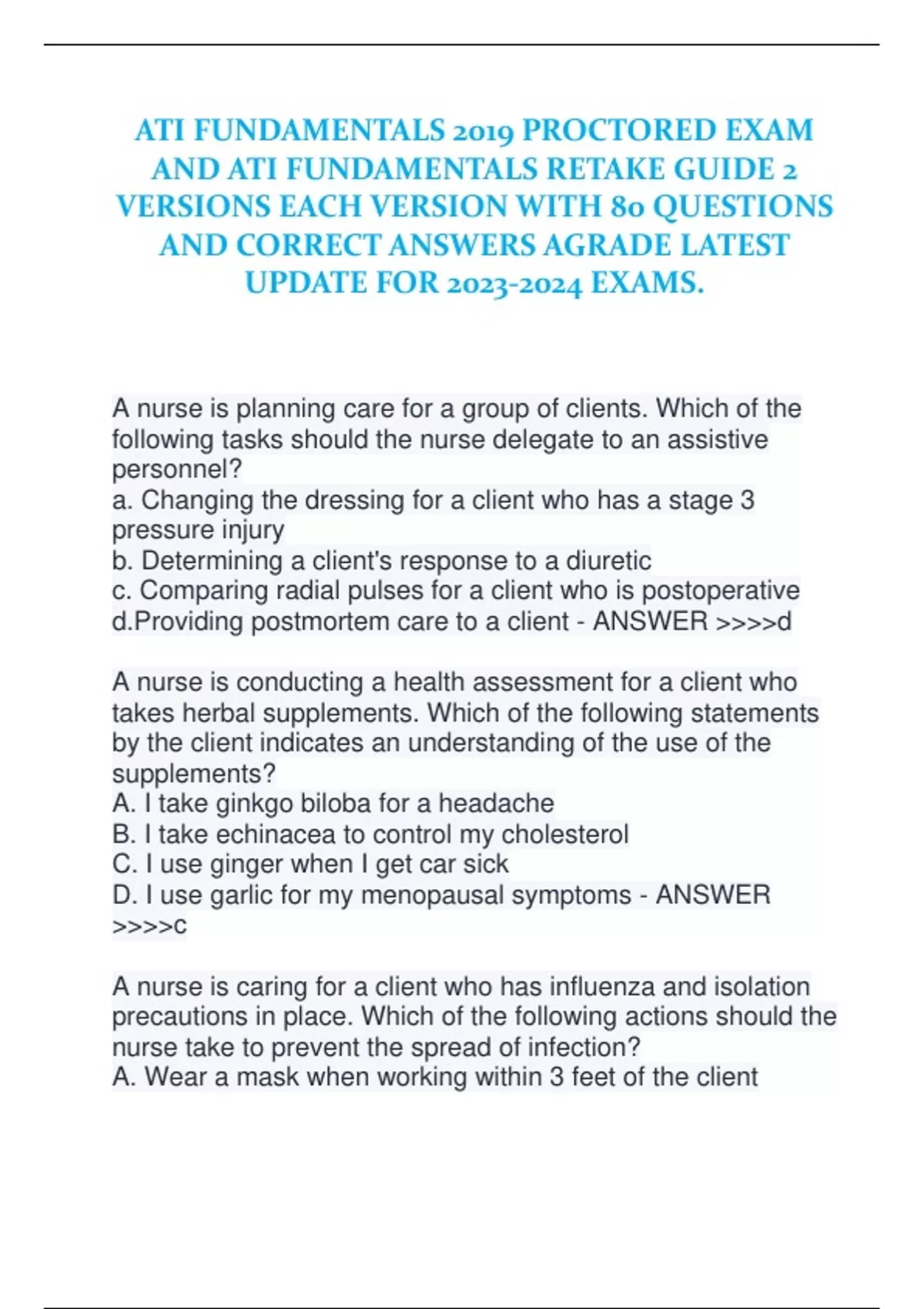 ATI FUNDAMENTALS 2019 PROCTORED EXAM AND ATI FUNDAMENTALS RETAKE GUIDE 2 VERSIONS EACH VERSION WITH 80 QUESTIONS AND CORRECT ANSWERS AGRADE LATEST UPDATE FOR EXAMS. A nurse is planning care for a group of clients. Which of the following tasks should the nurse delegate to an assistive personnel? a. Changing the dressing for a client who has a stage 3 pressure injury b. Determining a client's response to a diuretic c. Comparing radial pulses for a client who is postoperative d.Providing postmortem care to a client - ANSWER >>>>d A nurse is conducting a health assessment for a client who takes herbal supplements. Which of the following statements by the client indicates an understanding of the use of the supplements? A. I take ginkgo biloba for a headache B. I take echinacea to control my cholesterol C. I use ginger when I get car sick D. I use garlic for my menopausal symptoms - ANSWER >>>>c A nurse is caring for a client who has influenza and isolation precautions in place. Which of the following actions should the nurse take to prevent the spread of infection? A. Wear a mask when working within 3 feet of the client B. Administer metronidazole C. Don protective eyewear before entering the room. D. Place the client in a negative airflow room. - ANSWER >>>>a A nurse obtains a prescription for wrist restraints for a client who is trying to pull out his NG tube. Which of the following actions should the nurse take? A. Attach the restraints securely to the side rails of the client's bed. B. Apply the restraints to allow as little movement as possible C.Allow room for two fingers to fit between the clients skin and the restraints d. remove the restraints every 4 hours - ANSWER >>>>c A nurse is admitting a client who has tuberculosis. Which of the following types of transmission precautions should the nurse plan to initiate? A. Droplet B. Airbornes c. protective environment d. contact - ANSWER >>>>b A nurse in a well-child clinic receives a telephone call from a parent who states that their child accidentally swallowed paint thinner. The child is awake and alert. Which of the following responses should the nurse make? A. Have your child drink one large glass of water. B. Hang up and call a poison control center hotline. C. Bring your child into the clinic later today. D. Induce vomiting in your child with syrup of ipecac. - ANSWER >>>>a A nurse is documenting a client's medical record. Which of the following entries should the nurse record. A. Oral temperature slightly elevated at 0800 B. Administered pain medication C. Incision without redness or drainage D. Drank adequate amounts of fluid with meals. - ANSWER >>>>b A nurse is providing oral care for a client who is unconscious. Which of the following actions should the nurse take? A. Place the client in a side-lying position. B. Brush the clients teeth daily C. Apply mineral oil to the client's lips D. Rinse the client's mouth with an alcohol-based mouthwash - ANSWER >>>>a A nurse is collaborating with a risk management team about potential legal issues involving client care. The nurse should identify which of the following situations is an example of negligence? A. A nurse administers a medication without first identifying the client. B. An assistive personnel discusses client care in the facility cafeteria with visitors present. C. A nurse begins a blood transfusion without obtaining consent. D. An assistive personnel prevents a client from leaving the facility. - ANSWER >>>>c A nurse is collecting a sputum specimen for culture from a client who has a respiratory infection. Which of the following actions should the nurse take?
