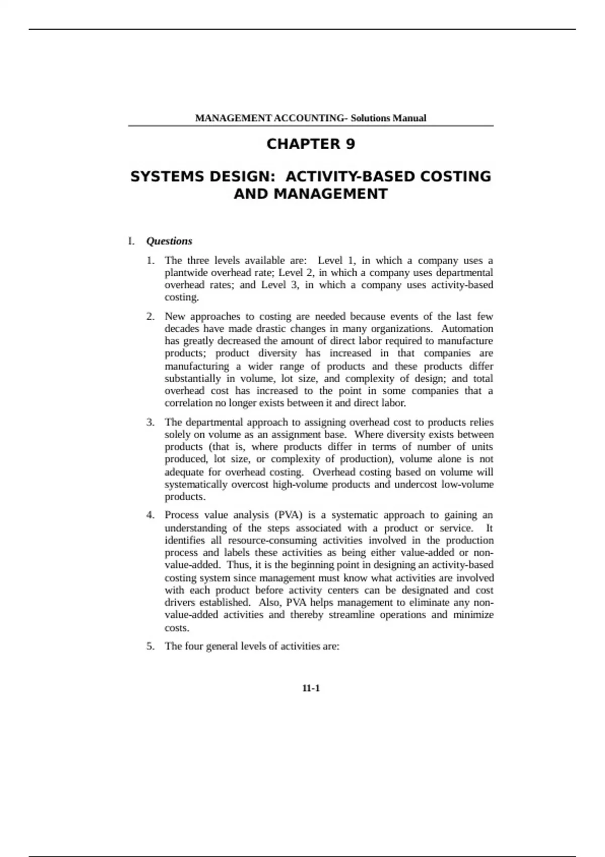 I. Questions 1. The three levels available are: Level 1, in which a company uses a plantwide overhead rate; Level 2, in which a company uses departmental overhead rates; and Level 3, in which a company uses activity-based costing. 2. New approaches to costing are needed because events of the last few decades have made drastic changes in many organizations. Automation has greatly decreased the amount of direct labor required to manufacture products; product diversity has increased in that companies are manufacturing a wider range of products and these products differ substantially in volume, lot size, and complexity of design; and total overhead cost has increased to the point in some companies that a correlation no longer exists between it and direct labor. 3. The departmental approach to assigning overhead cost to products relies solely on volume as an assignment base. Where diversity exists between products (that is, where products differ in terms of number of units produced, lot size, or complexity of production), volume alone is not adequate for overhead costing. Overhead costing based on volume will