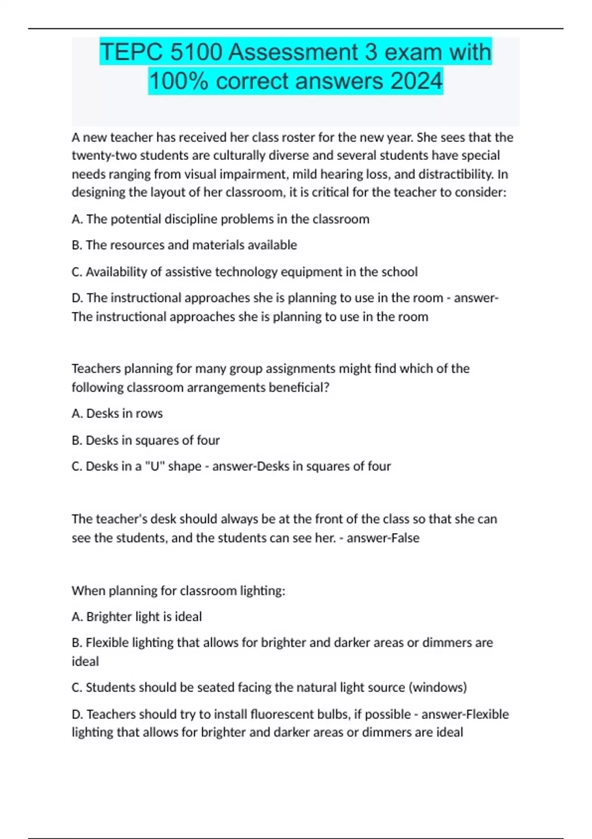 A new teacher has received her class roster for the new year. She sees that the twenty-two students are culturally diverse and several students have special needs ranging from visual impairment, mild hearing loss, and distractibility. In designing the layout of her classroom, it is critical for the teacher to consider: A. The potential discipline problems in the classroom B. The resources and materials available C. Availability of assistive technology equipment in the school D. The instructional approaches she is planning to use in the room - answer-The instructional approaches she is planning to use in the room Teachers planning for many group assignments might find which of the following classroom arrangements beneficial? A. Desks in rows B. Desks in squares of four C. Desks in a "U" shape - answer-Desks in squares of four The teacher's desk should always be at the front of the class so that she can see the students, and the students can see her. - answer-False When planning for classroom lighting: A. Brighter light is ideal B. Flexible lighting that allows for brighter and darker areas or dimmers are ideal C. Students should be seated facing the natural light source (windows) D. Teachers should try to install fluorescent bulbs, if possible - answer-Flexible lighting that allows for brighter and darker areas or dimmers are ideal In teaching students to follow procedures, teachers should do all of the following EXCEPT: A. Set escalating consequences for failing to follow procedures B. Consistently model the desired procedure C. Give students opportunities to practice the desired procedure D. Ask students to re-do a procedure that was done incorrectly the first time E. Clearly post expectations and label stations around the classroom - answer-Set escalating consequences for failing to follow procedures A good way to deal with papers in the classroom is to: A. Alphabetize student work in a single file, regardless of class period B. Color-code folders by class period and touch each paper only once C. Require students to personally request making-up work from the teacher instead of retrieving it from the make-up station D. Scan every student work product so that the teacher has a back-up copy - answer-Color-code folders by class period and touch each paper only once