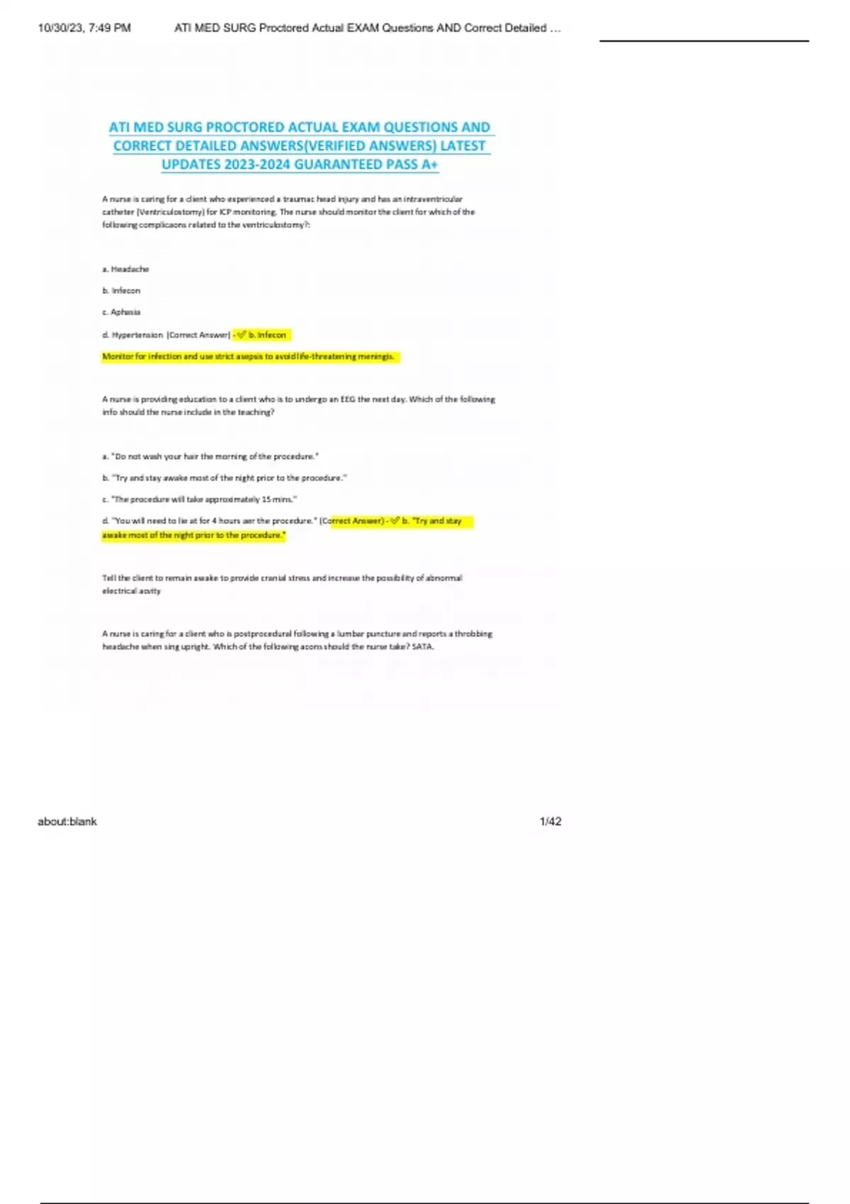 ATI MED SURG PROCTORED ACTUAL EXAM QUESTIONS AND CORRECT DETAILED ANSWERS(VERIFIED ANSWER S) LATEST UPDATES GUARANTEED PASS A+ A nurse is caring f or a client wh o experienced a trau matic head inju ry and has an intraventricular catheter (Ventricul ostomy) for ICP monitoring. Th e nu rse should monitor the client for which of the following complications related the ventricul ostomy?: to a. Headache b. Infection c. Aph asia d. Hypertension (Correct Answer) - b. Infectio n Monitor for in fect ion and use strict asepsi s avoid life-threatening m eningitis. to A nurse is providing educat ion to a client who i s to undergo an EEG the next day. Which of the following info should the nurse inclu de the teaching ? in a. "Do not wa sh your hair the morning of the procedure." b. "Try and stay awake most of the night prior to the procedu re." c. "The procedure will take ap proximately 15 mins." d. "You will need to lie flat f or 4 hours after the procedu re." (Correct Answer) - b. "Try and stay awake most of the night p rior the procedu re." to Tell th e client to remain awake pr ovide cranial stre ss and increase the possibility to of abnormal electrical acti vity A n urse caring for a client who p o stprocedu ral following a lumbar puncture and reports a throbbing is is headache when sitting upright. Which of the following actions should the nurse ta ke ? SATA.