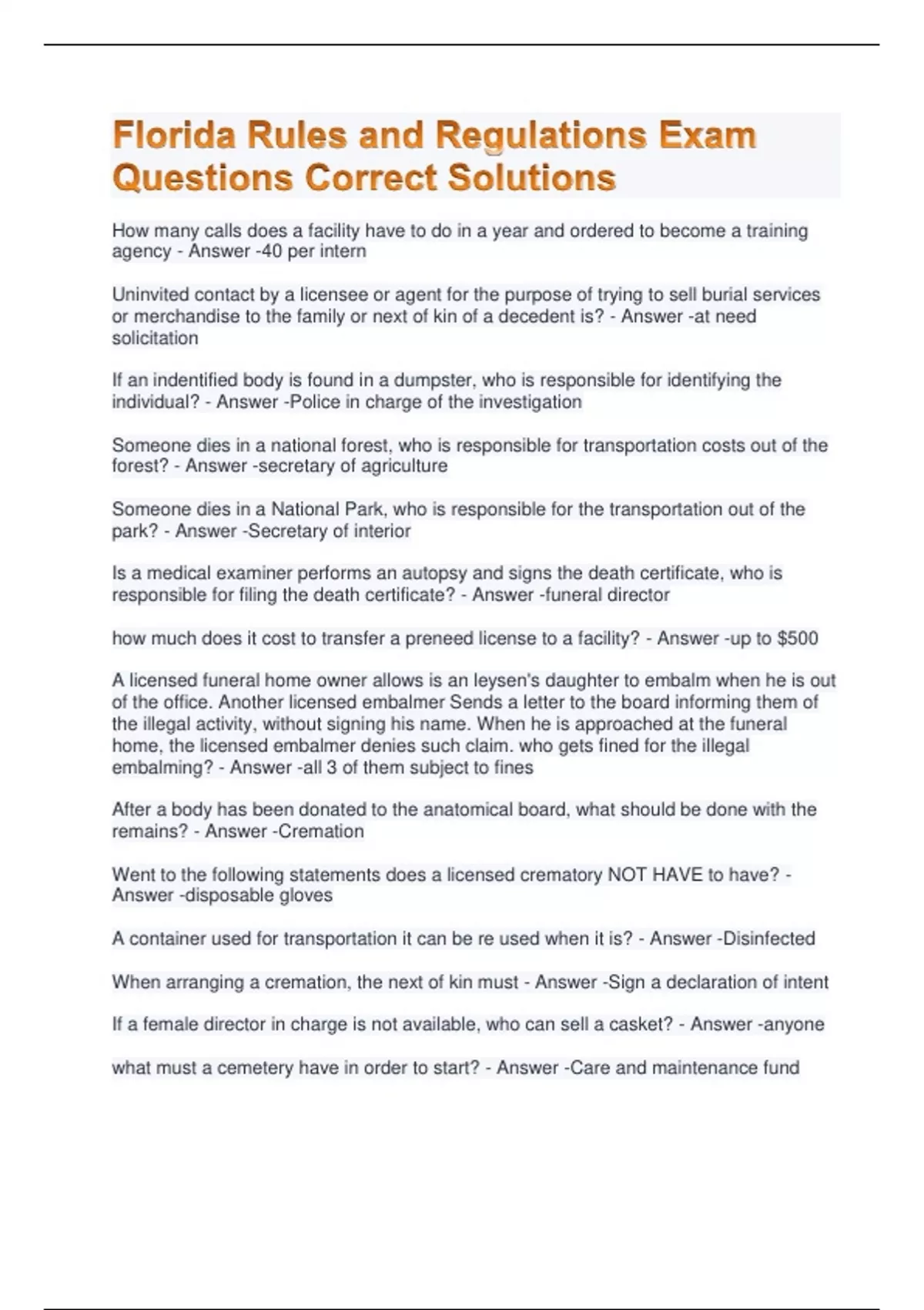 Florida Rules and Regulations Exam Questions Correct Solutions How many calls does a facility have to do in a year and ordered to become a training agency - Answer -40 per intern Uninvited contact by a licensee or agent for the purpose of trying to sell burial services or merchandise to the family or next of kin of a decedent is? - Answer -at need solicitation If an indentified body is found in a dumpster, who is responsible for identifying the individual? - Answer -Police in charge of the investigation Someone dies in a national forest, who is responsible for transportation costs out of the forest? - Answer -secretary of agriculture Someone dies in a National Park, who is responsible for the transportation out of the park? - Answer -Secretary of interior Is a medical examiner performs an autopsy and signs the death certificate, who is responsible for filing the death certificate? - Answer -funeral director how much does it cost to transfer a preneed license to a facility? - Answer -up to $500 A licensed funeral home owner allows is an leysen's daughter to embalm when he is out of the office. Another licensed embalmer Sends a letter to the board informing them of the illegal activity, without signing his name. When he is approached at the funeral home, the licensed embalmer denies such claim. who gets fined for the illegal embalming? - Answer -all 3 of them subject to fines After a body has been donated to the anatomical board, what should be done with the remains? - Answer -Cremation Went to the following statements does a licensed crematory NOT HAVE to have? - Answer -disposable gloves