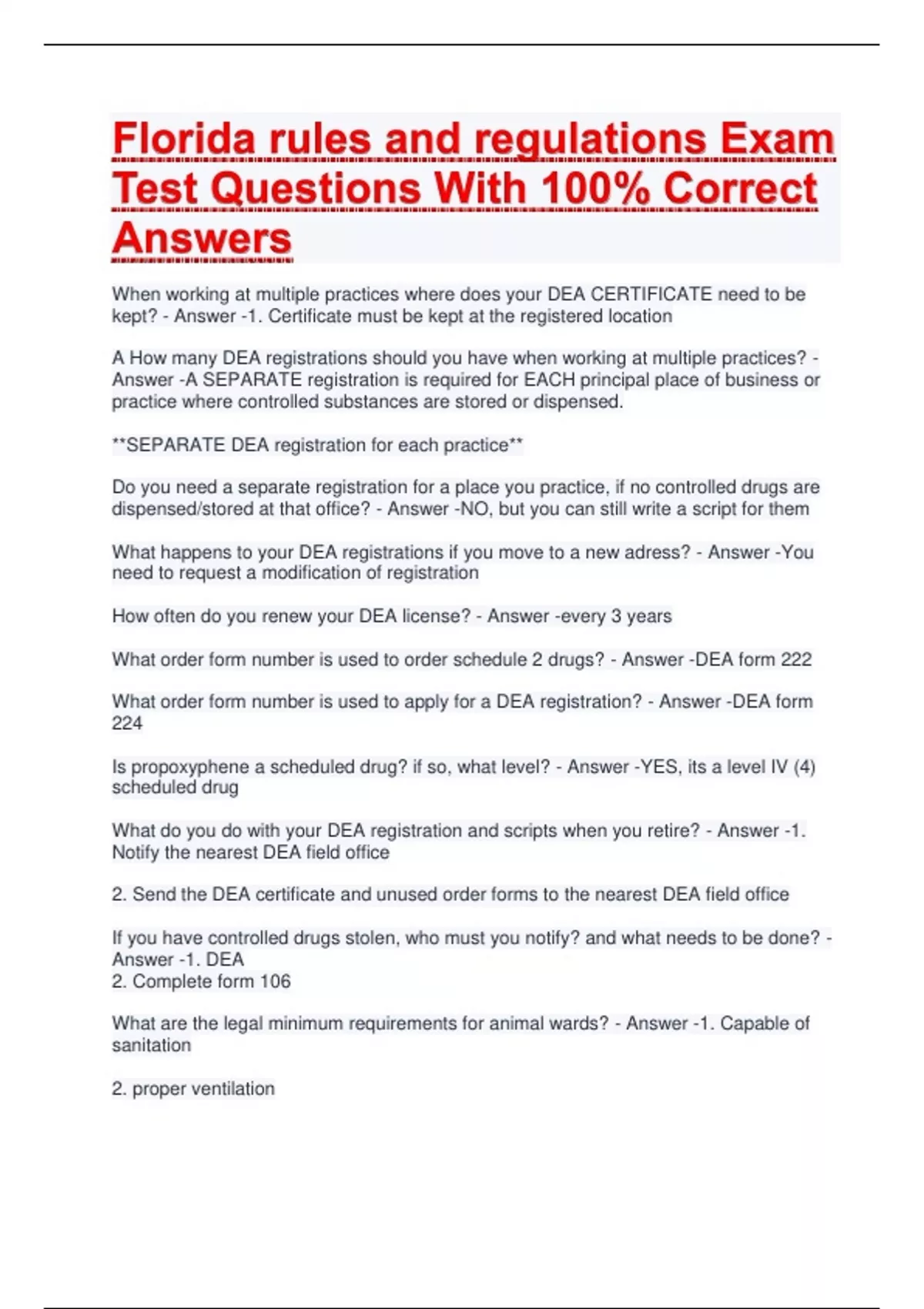 Florida rules and regulations Exam Test Questions With 100% Correct Answers When working at multiple practices where does your DEA CERTIFICATE need to be kept? - Answer -1. Certificate must be kept at the registered location A How many DEA registrations should you have when working at multiple practices? - Answer -A SEPARATE registration is required for EACH principal place of business or practice where controlled substances are stored or dispensed. **SEPARATE DEA registration for each practice** Do you need a separate registration for a place you practice, if no controlled drugs are dispensed/stored at that office? - Answer -NO, but you can still write a script for them What happens to your DEA registrations if you move to a new adress? - Answer -You need to request a modification of registration How often do you renew your DEA license? - Answer -every 3 years What order form number is used to order schedule 2 drugs? - Answer -DEA form 222 What order form number is used to apply for a DEA registration? - Answer -DEA form 224 Is propoxyphene a scheduled drug? if so, what level? - Answer -YES, its a level IV (4) scheduled drug What do you do with your DEA registration and scripts when you retire? - Answer -1. Notify the nearest DEA field office 2. Send the DEA certificate and unused order forms to the nearest DEA field office If you have controlled drugs stolen, who must you notify? and what needs to be done? - Answer -1. DEA 2. Complete form 106 What are the legal minimum requirements for animal wards? - Answer -1. Capable of sanitation 2. proper ventilation 3. sufficient lighting 4. size consistent with welfare of animal What are the legal minimum requirements for exam rooms? - Answer -1. Clean/ lined waste receptacle 2. sink -**SINKS IN RESTROOMS DO NOT COUNT** 3. disposable towels 4. impervious exam tables Do you need a soap dispenser in your exam rooms? - Answer -NO What are the legal minimum requirements for your pharmacy? - Answer -1. Clean BLOOD STORAGE OR DONOR AVAILABLE 2. accurate controlled substance log 3. individual patient records 4. locking cabinet for controlled Drugs 5. DEA certificate 6. Segregated area for expired drugs 7. disposable needles and syringes What are the legal minimum requirements for your CPR area ? (maybe referring to surgery?) - Answer -1. for it to be clean and orderly 2. sterile instruments 3. drapes, caps, and masks 4. impervious OR table 5. **O2 AND equipment for its administration**