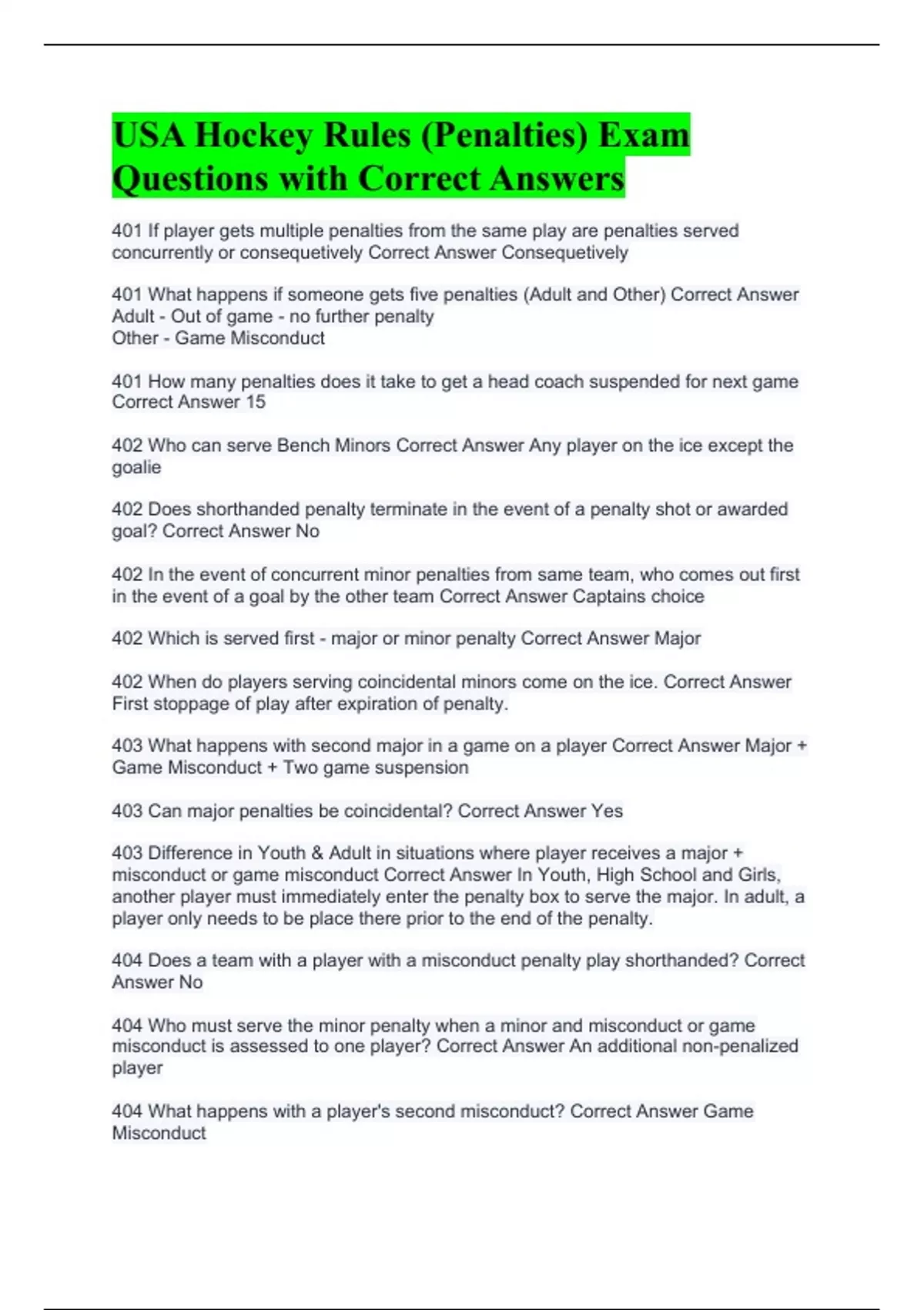 USA Hockey Rules (Penalties) Exam Questions with Correct Answers