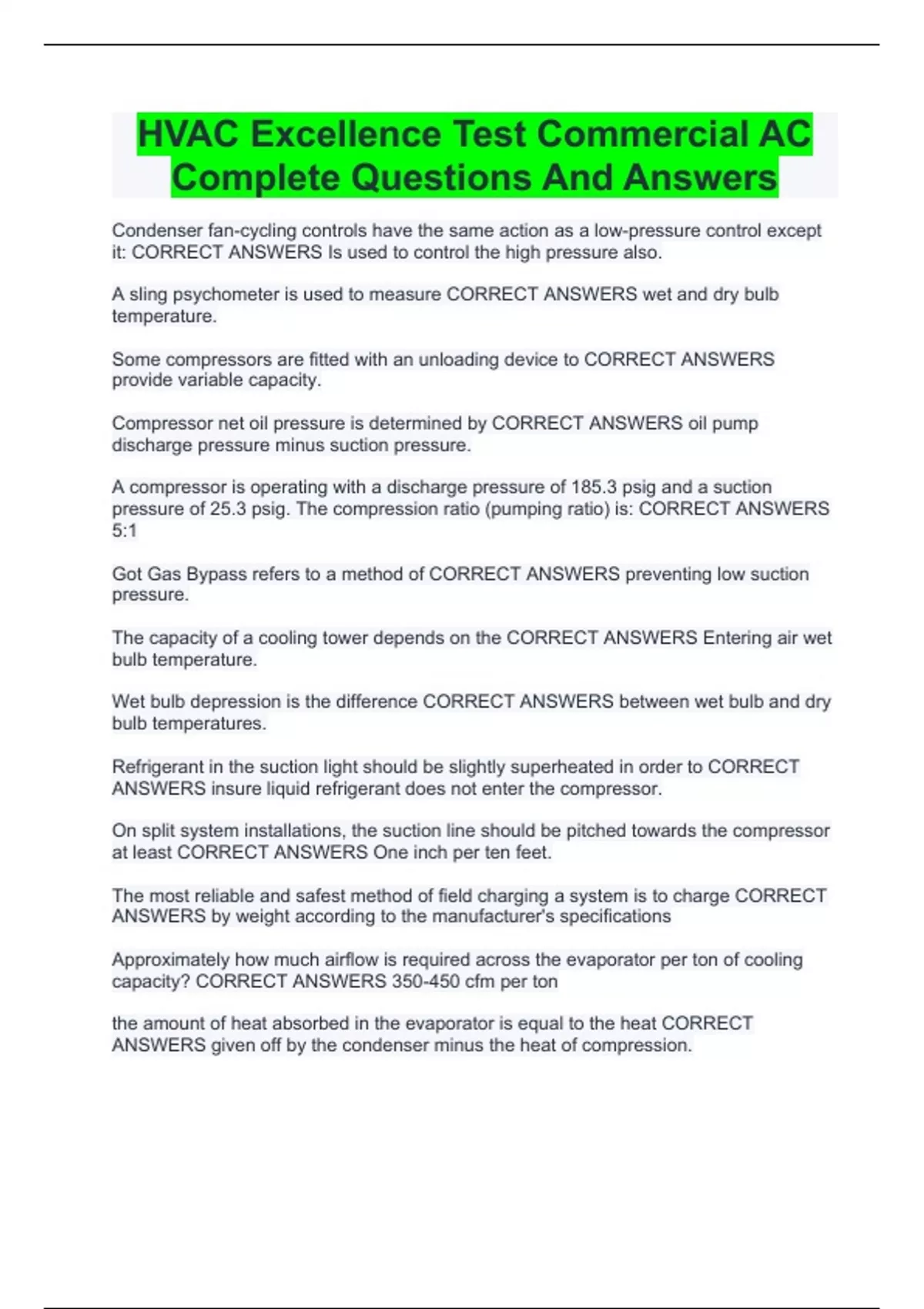 the amount of heat absorbed in the evaporator is equal to the heat CORRECT ANSWERS given off by the condenser minus the heat of compression. If a TEV sensing bulb has lost all of its charge, what effect would this have on the air conditioning system? CORRECT ANSWERS It would cause low side pressure to increase.