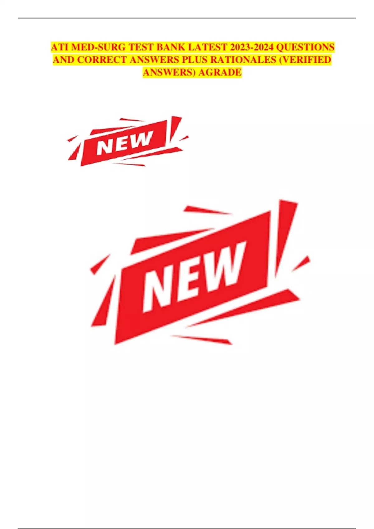 ATI MED-SURG TEST BANK LATEST QUESTIONS AND CORRECT ANSWERS PLUS RATIONALES (VERIFIED ANSWERS) AGRADE 1. A nurse is reinforcing teaching with a client who has HIV and is being discharged to home. Which of the following instructions should the nurse include in the teaching? 1) Take temperature once a day. Answer Rationale: The nurse should reinforce to the client to take his temperature once a daily to identify if a temperature is present due to the client’s altered immune system. INCORRECT 2) Wash the armpits and genitals with a gentle cleanser daily. Answer Rationale: The nurse should instruct the client to use an antimicrobial cleanser to wash his armpits and genitals twice daily. INCORRECT 3) Change the litter boxes while wearing gloves. Answer Rationale: The client should avoid changing litter boxes. Litter boxes carry toxoplasmosis which can be life threatening to a client who has HIV. INCORRECT 4) Wash dishes in warm water. Answer Rationale: The nurse should instruct the client to wash dishes in hot soapy water to destroy the bacteria. 2. A nurse is caring for a client who is postoperative following a tracheostomy, and has copious and tenacious secretions. Which Answer Rationale: Performing chest physiotherapy mobilizes secretions but does not thin them. INCORRECT 3) Prelubricate the suction catheter tip with sterile saline when suctioning the airway. Answer Rationale: Prelubricating the suction catheter tip with sterile saline helps to ease the insertion of the catheter, producing less trauma. However, it has no effect on the tenacity of the client's secretions. INCORRECT 4) Hyperventilate the client with 100% oxygen before suctioning the airway