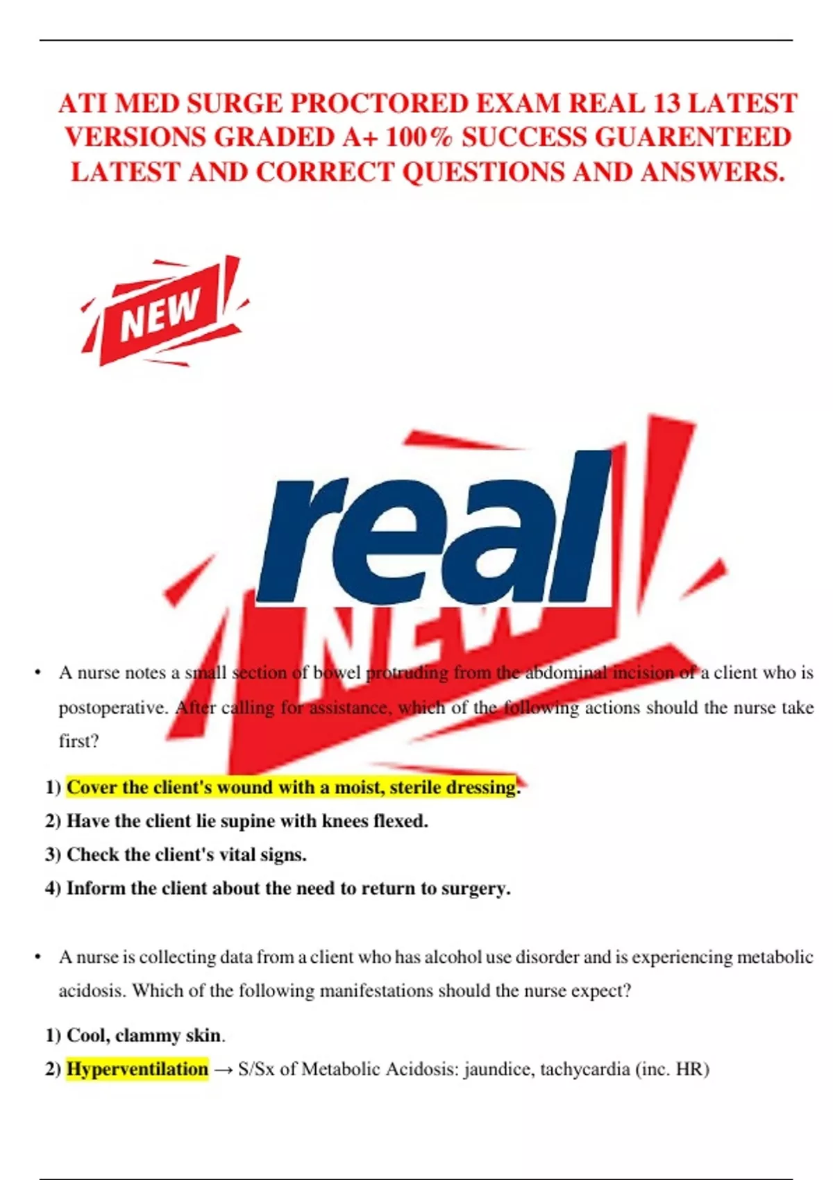 A nurse notes a small section of bowel protruding from the abdominal incision of a client who is postoperative. After calling for assistance, which of the following actions should the nurse take first? 1) Cover the client's wound with a moist, sterile dressing. 2) Have the client lie supine with knees flexed. 3) Check the client's vital signs. 4) Inform the client about the need to return to surgery. • A nurse is collecting data from a client who has alcohol use disorder and is experiencing metabolic acidosis. Which of the following manifestations should the nurse expect? 1) Cool, clammy skin. 2) Hyperventilation → S/Sx of Metabolic Acidosis: jaundice, tachycardia (inc. HR) Confusion, fatigue, rapid and shallow breathing, headache, sleepiness, 3) Increased blood pressure 4) Bradycardia A nurse is reinforcing discharge teaching with a client following a cataract extraction. Which of the following should the nurse include in the teaching? 1) Avoid bending at the waist. → brings more pressure to the eyes; bending over can cause a rush of blood to your head that interferes with recovery 2) Remove the eye shield at bedtime. 3) Limit the use of laxatives if constipated. 4) Seeing flashes of light is an expected finding following extraction. A nurse is caring for a client who has heart failure and has been taking digoxin 0.25 mg daily. The client refuses breakfast and reports nausea. Which of the following actions should the nurse take first? 1) Suggest that the client rests before eating the meal. 2) Request a dietary consult. 3) Check the client's vital signs. → adverse effect of digoxin can be nausea, and with them being in heart failure it increases their risk of digoxin toxicity 4) Request an order for an antiemetic. .A nurse is caring for a client who is 3 days postoperative following a cholecystectomy (gallbladder removal). The nurse suspects the client's wound is infected because the drainage from the dressing is yellow and thick. Which of the following findings should the nurse report as the type of drainage found? 1) Sanguineous - bright red 2) Serous - clear drainage 3) Serosanguineous - pink-tinged drainage, but can look clear 4) Purulent - white, yellow or brown thick fluid (sign of an infection) .A nurse is reinforcing discharge teaching to a client following arthroscopic surgery. To prevent postoperative complications which of the following actions should be reinforced during the teaching? 1) Administer an opioid analgesic to the client 30 min prior to initiating CPM (continuous passive motion) exercises. 2) Place the client’s affected leg into the CPM machine with the machine in the flexed position. 3) Place the client into a high Fowler’s position when initiating the CPM exercises. 4) Align the joints of the CPM machine with the knee gatch in the client’s bed.